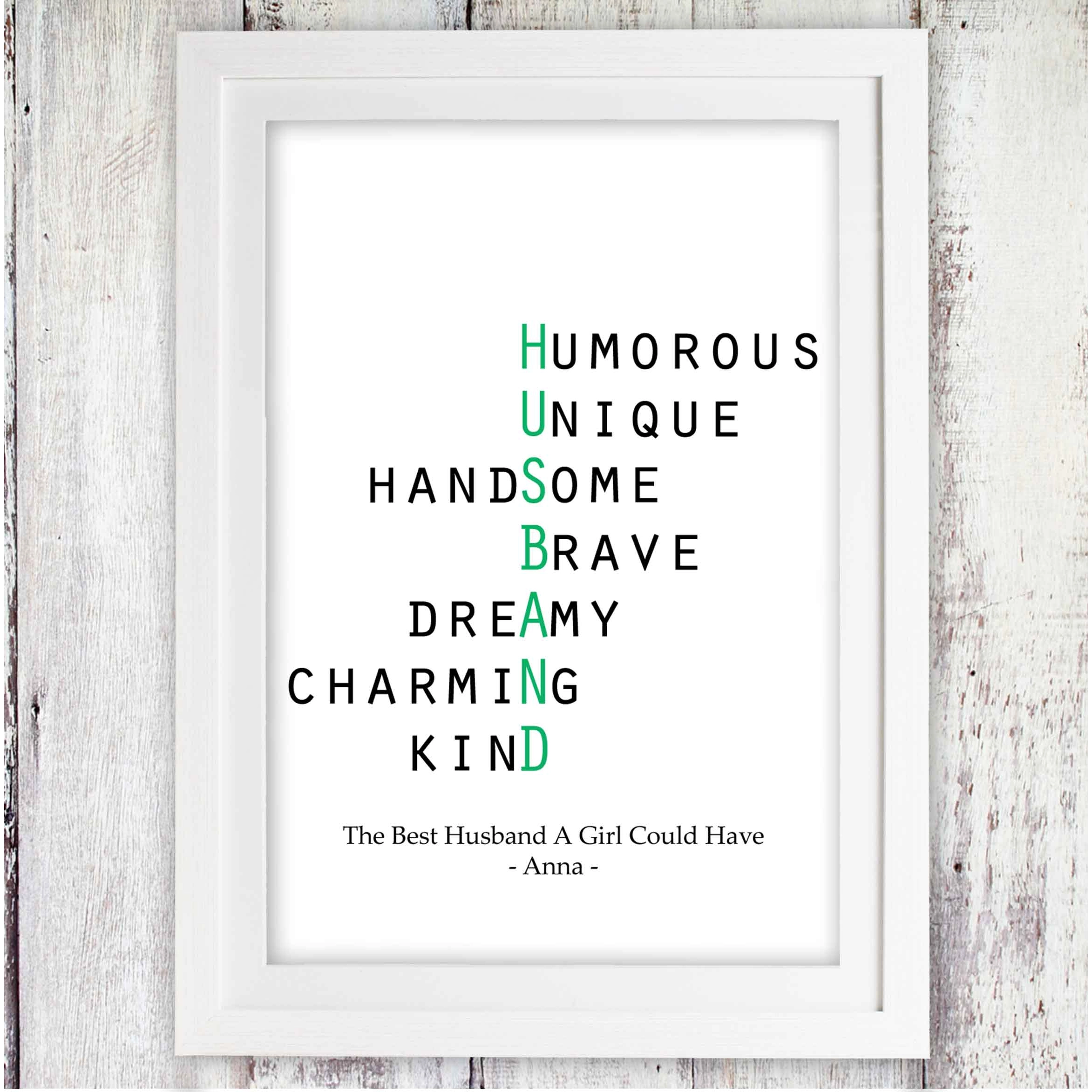 Celebrate your husband with a truly heartfelt and personalised gift – the Husband Acrostic Poem Poster. This unique and charming print allows you to craft a bespoke acrostic poem using your husband's name, capturing all the wonderful qualities you love about him.