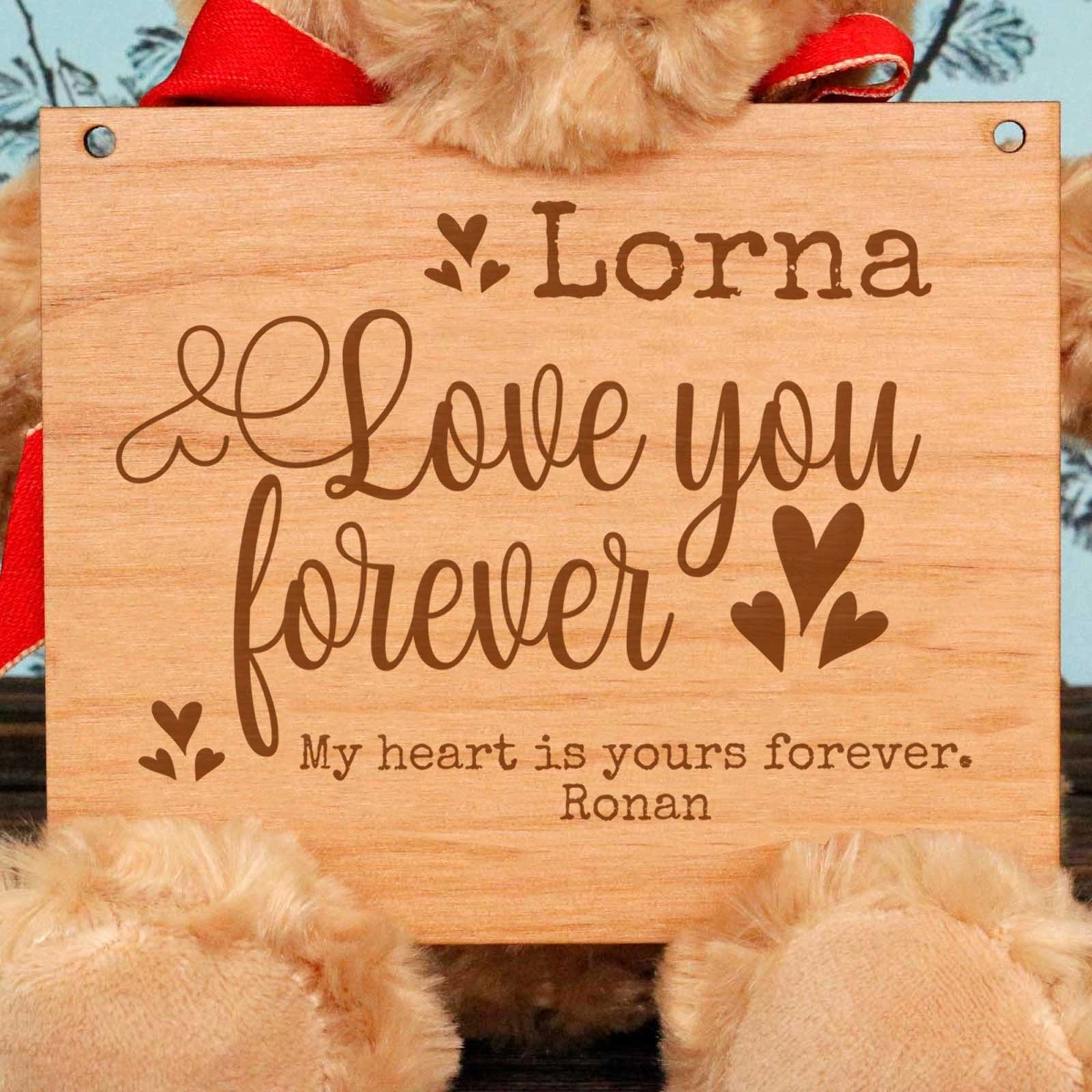 Show your love with the I Love You Forever Wooden Plaque Personalised Teddy Bear. Customise this sweet bear with any name and message to make it a truly unique and heartfelt gift. Perfect for any occasion—whether it's an engagement, birthday, Mother's Day, Valentine's Day, Christmas, or simply to show someone you care.