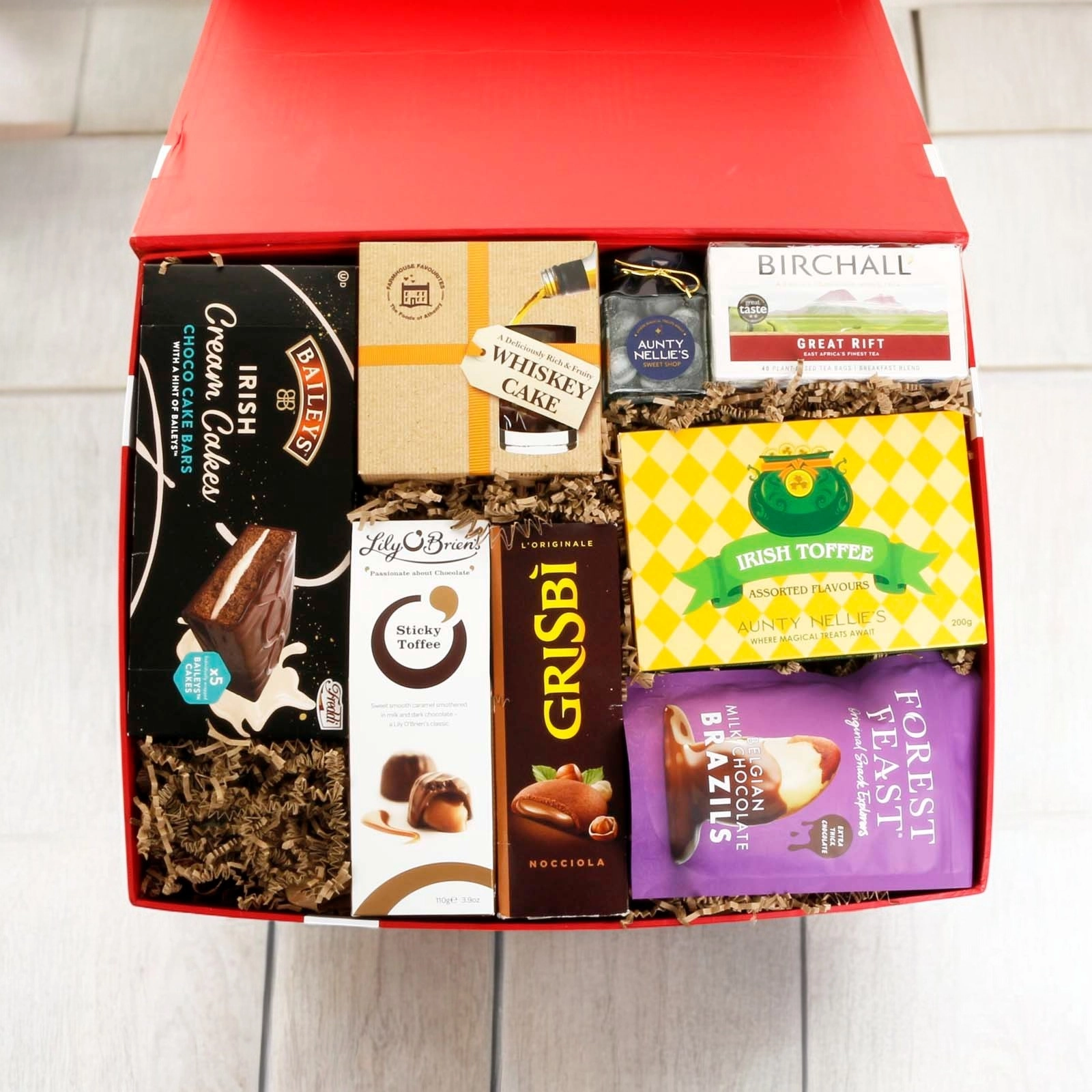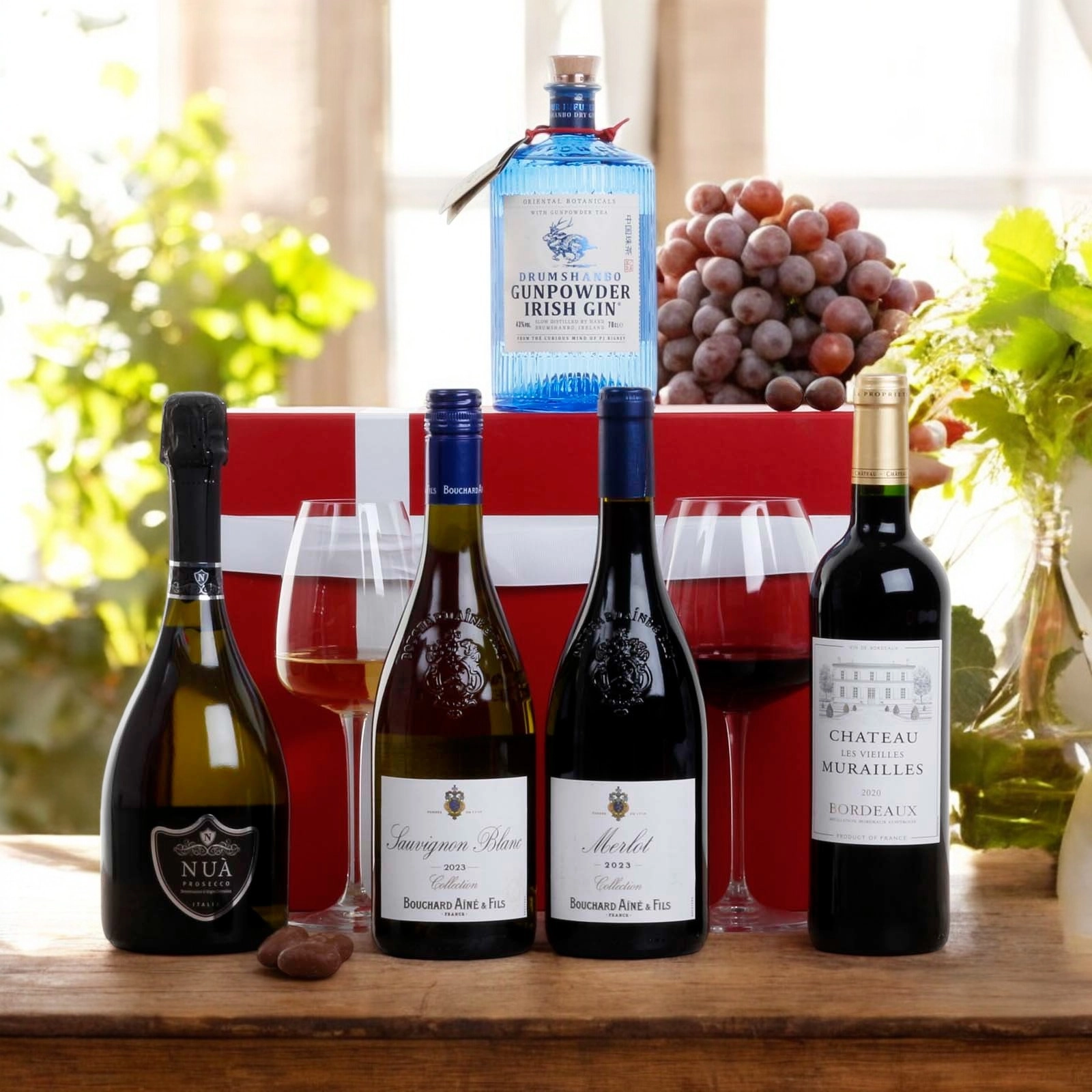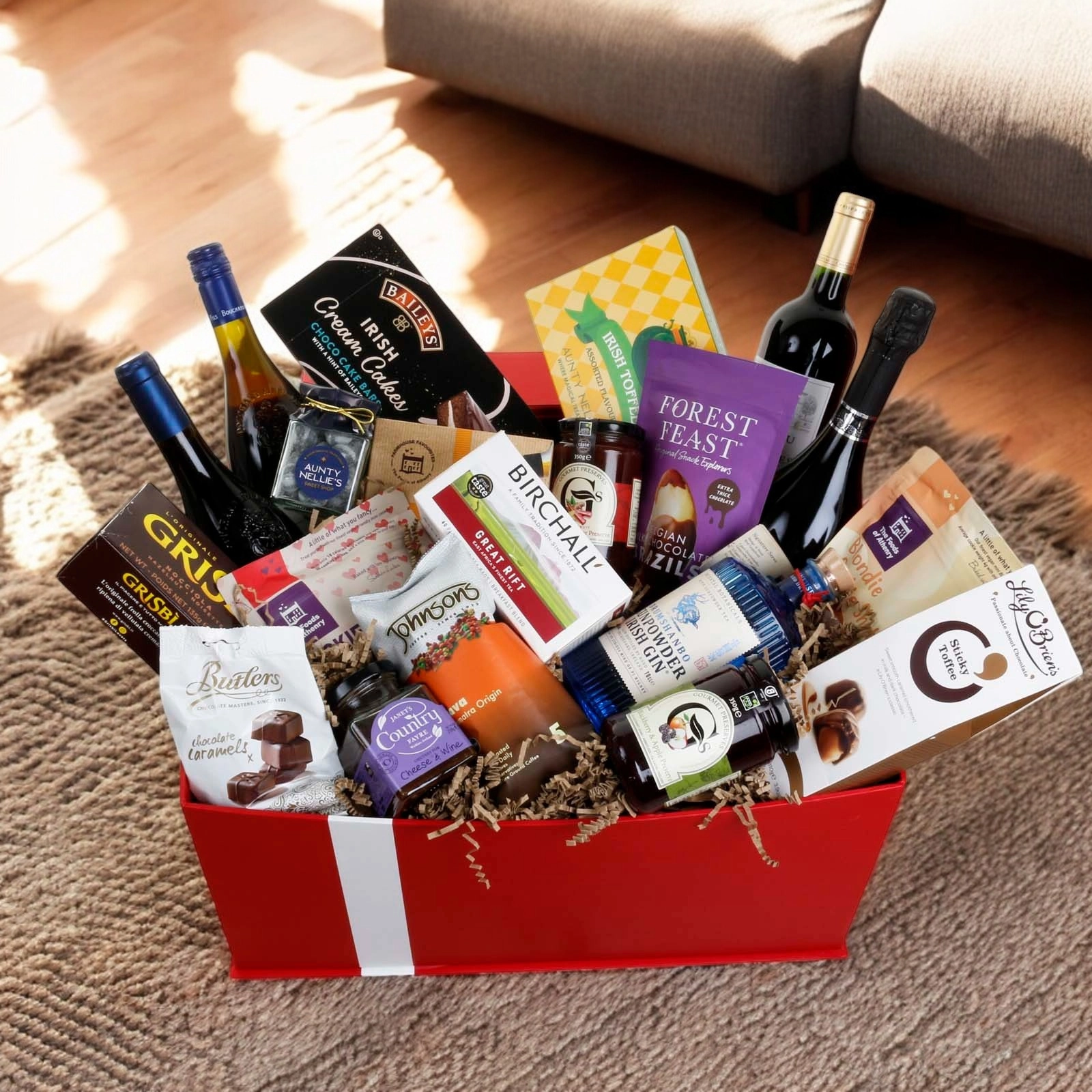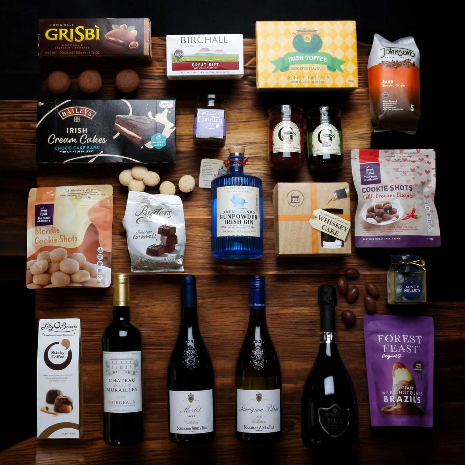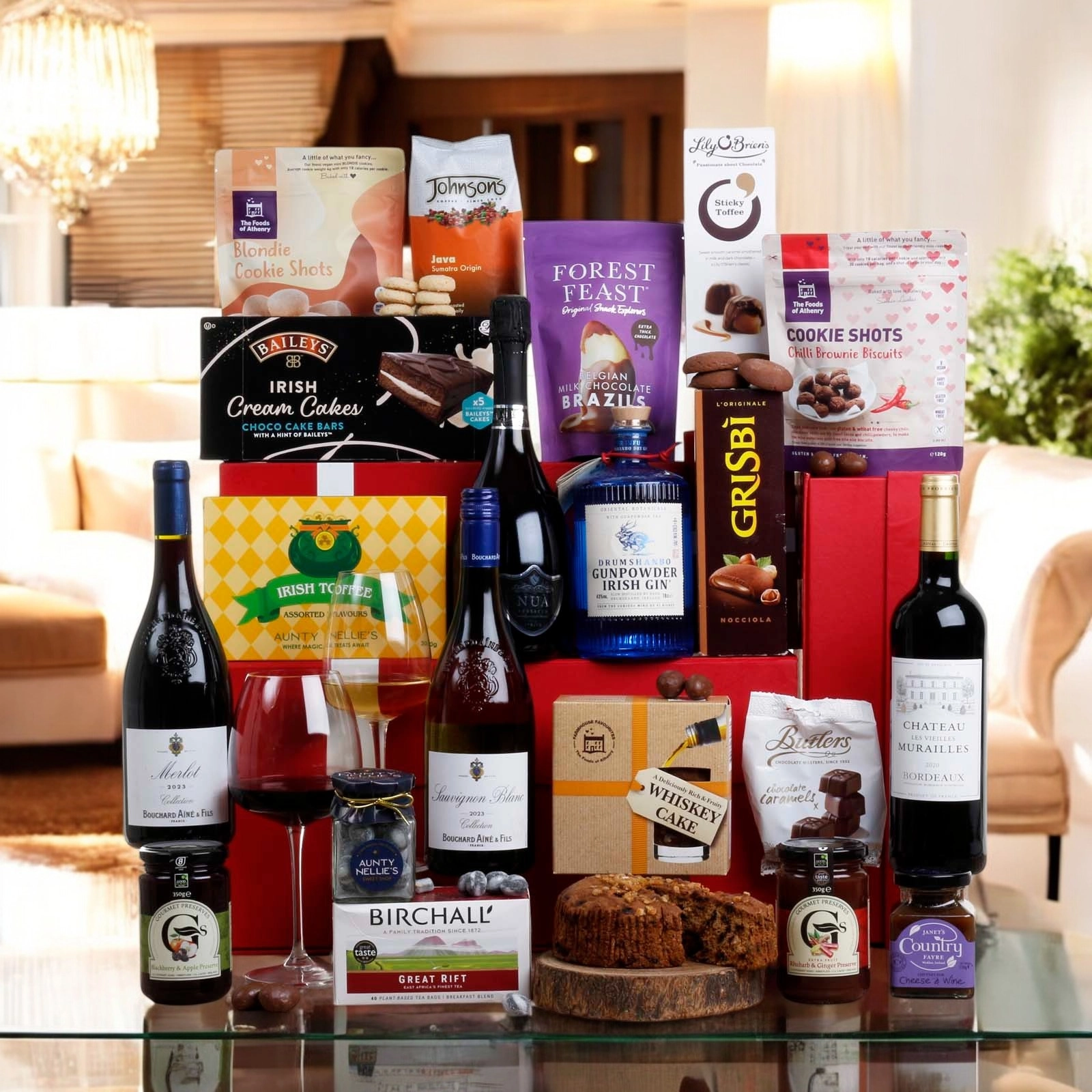Indulge in a selection of gourmet delights with this luxurious gift hamper, perfect for any special occasion. Featuring fine wines, Irish gin, and a rich whiskey cake, this collection also includes artisanal chocolates, premium biscuits, teas, and toffees. Highlights include Baileys Irish Cream Cakes, Forest Feast dark chocolate brazils, and Chateau Murailles Bordeaux. Beautifully presented, this hamper offers a taste of elegance and indulgence in every bite and sip.