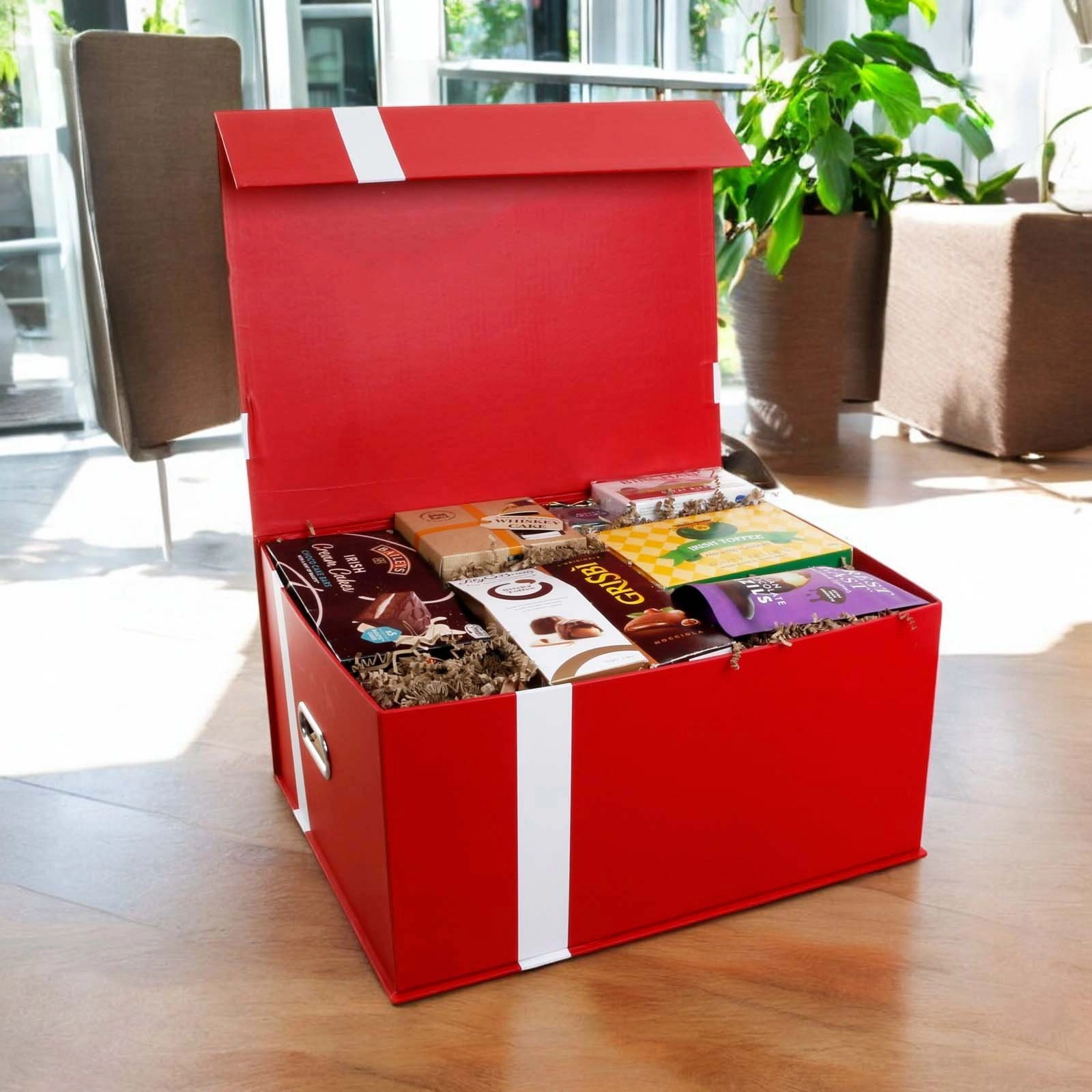 The hamper is presented in our signature red gift box. Stylish and reusable, the gift box is packed inside a separate shipping box for secure transport.