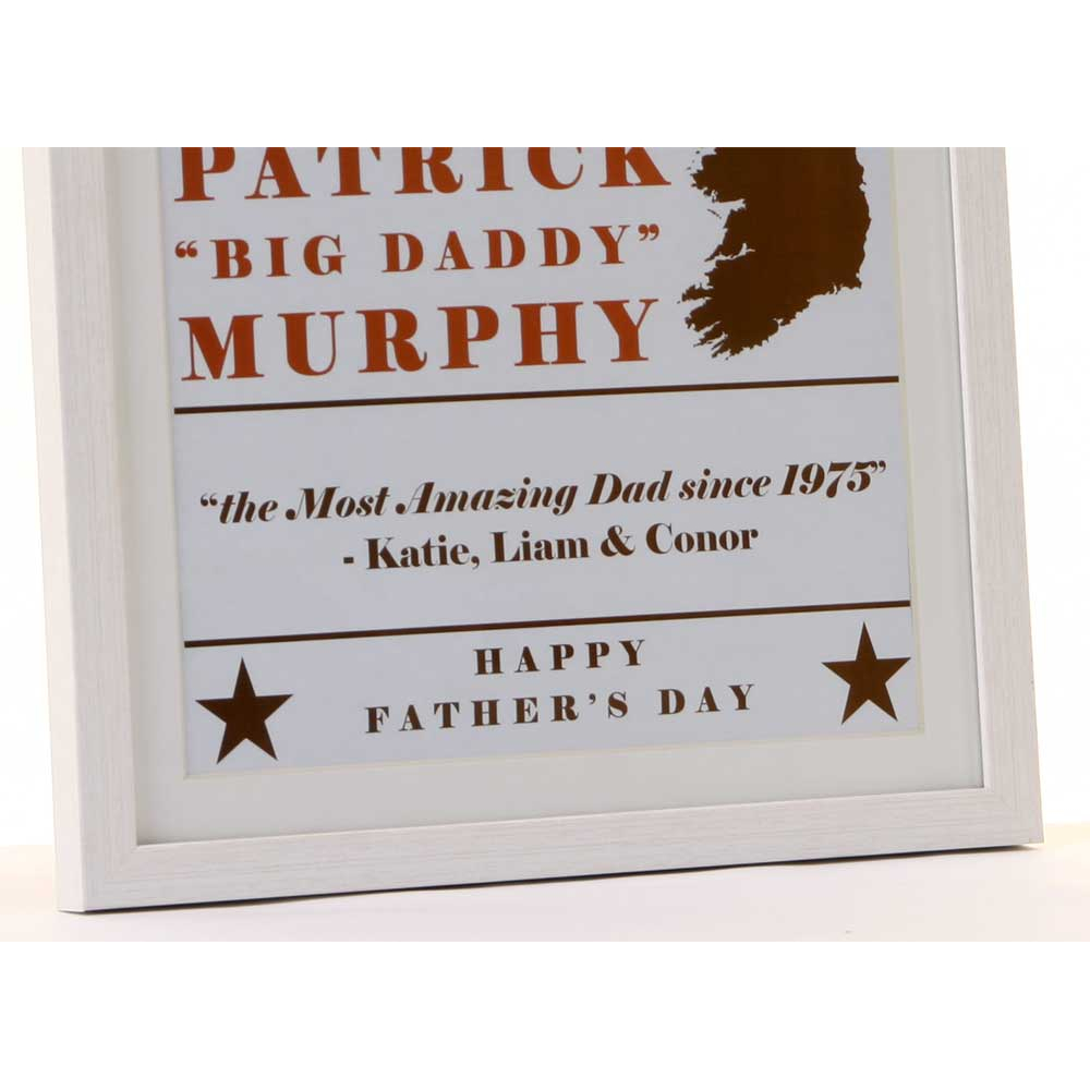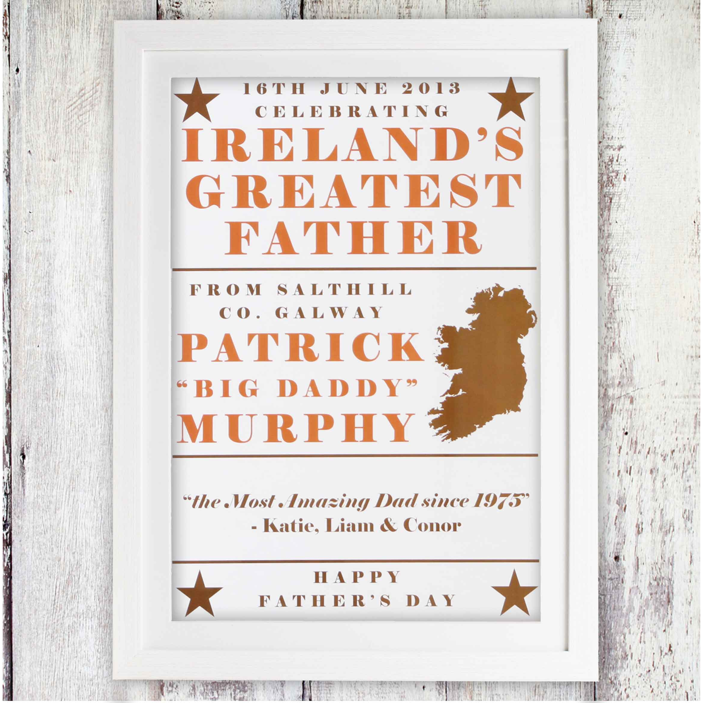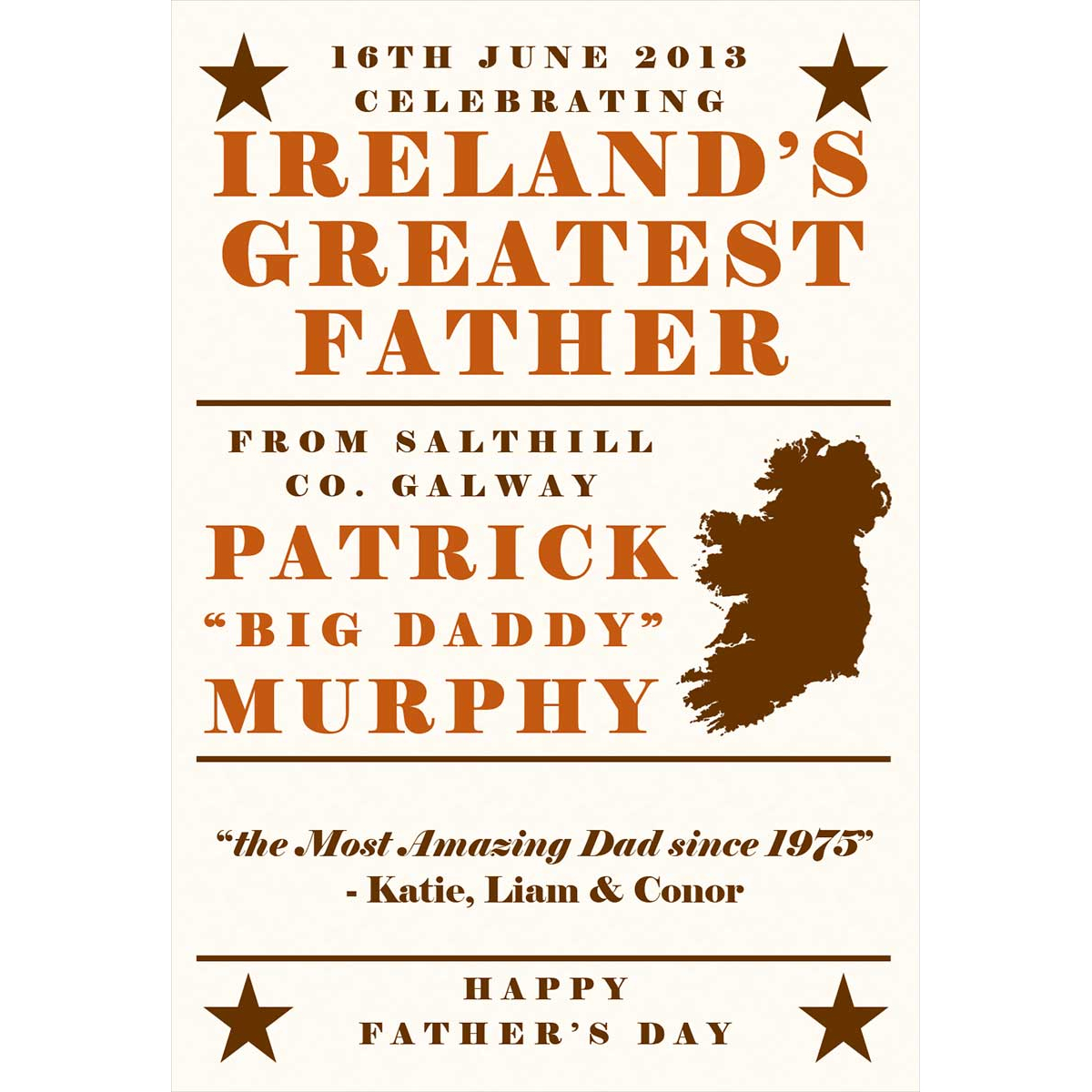 A novel gift to certify your Dad really is Ireland's Greatest Dad! The print contains Dad's full name, where he is from (town and county), the year he first became a father and his children's names.