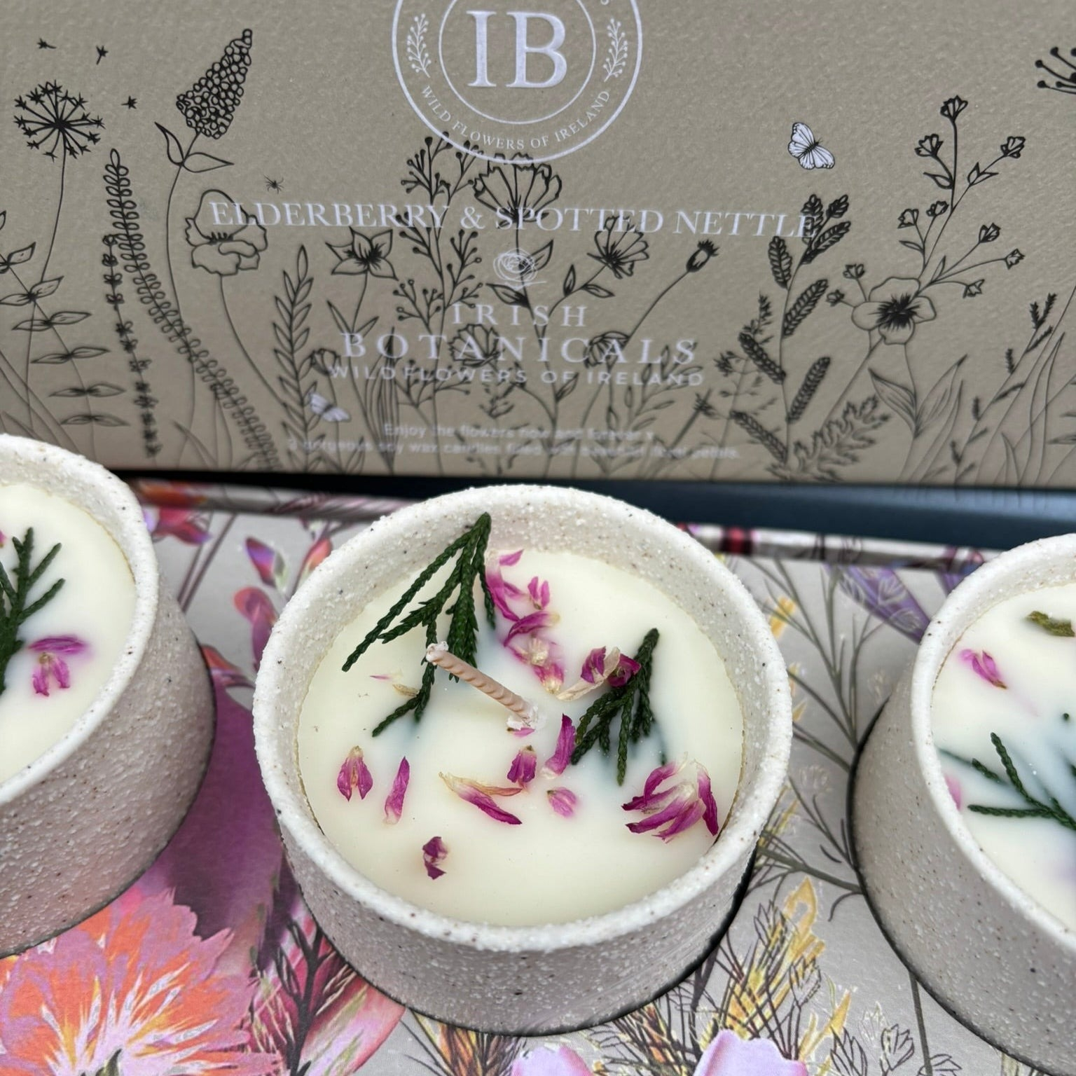 The Irish Botanicals Wildflowers of Ireland Candle Trio combines the rich, fruity essence of elderberry with the fresh, green aroma of spotted nettle. Each candle offers a clean, long-lasting burn that gently fills your space with a soothing and uplifting fragrance.