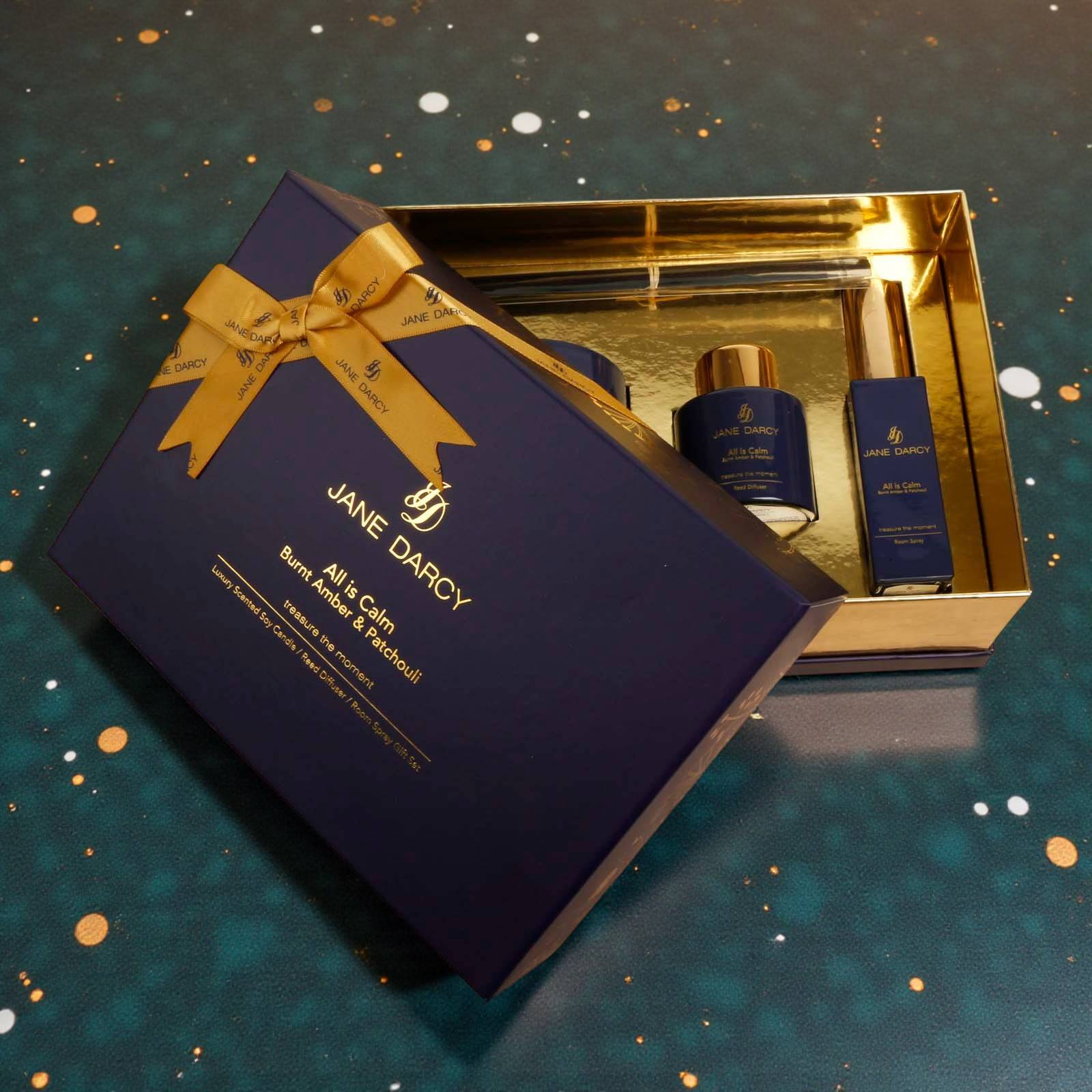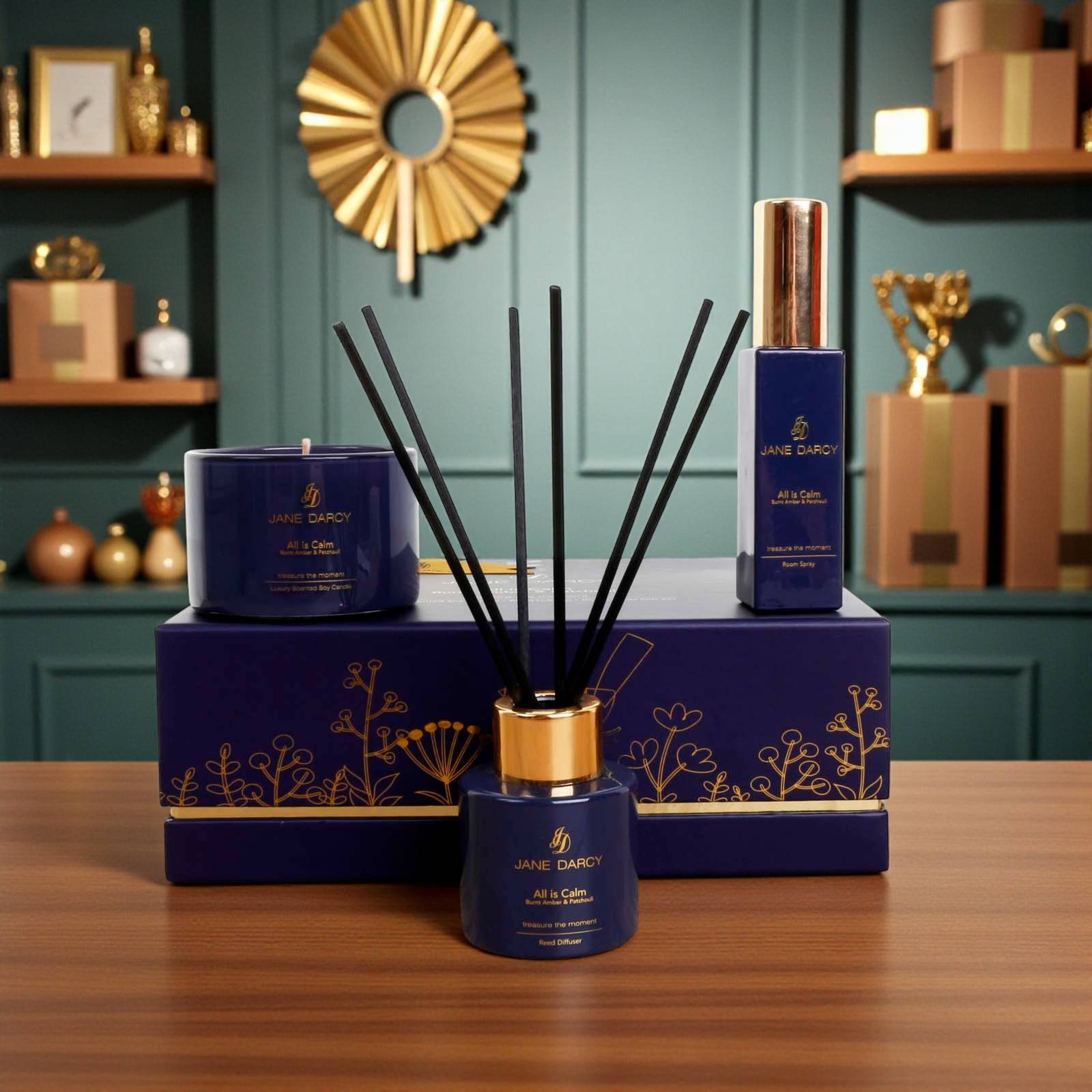 We have created a unique gift set for you to enjoy. Our signature natural soy wax candle, teamed with our renowned luxury reed diffuser and finished with our stunning new room spray. A mini collection of all of your favourites. The perfect gift to create that calm space to relax and unwind.