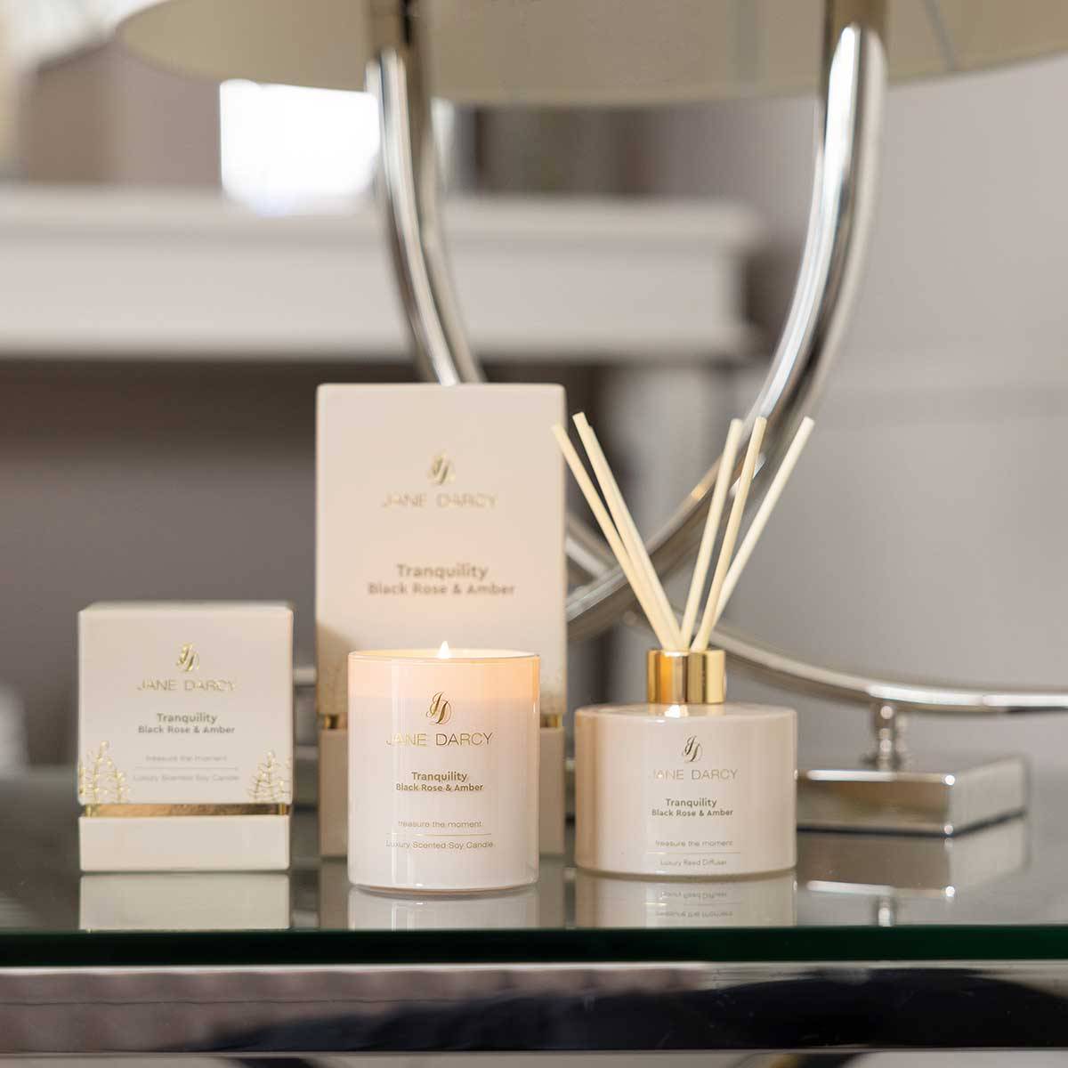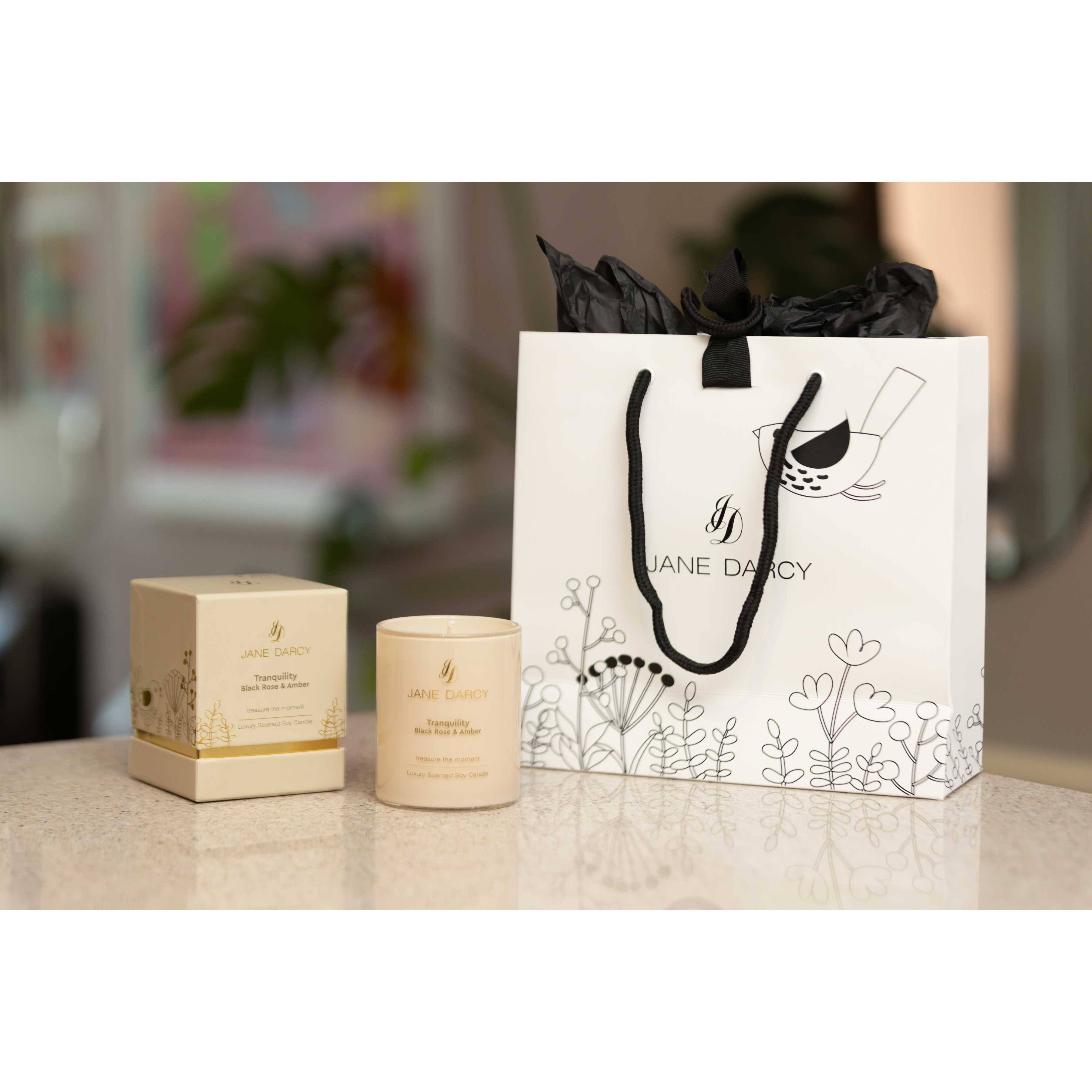 Each Jane Darcy gift set is accompanied by a complementary box of matches and a handwritten personalizable gift card, presented in a luxurious gift box, and finished with a beautiful hand tied gift bag.
