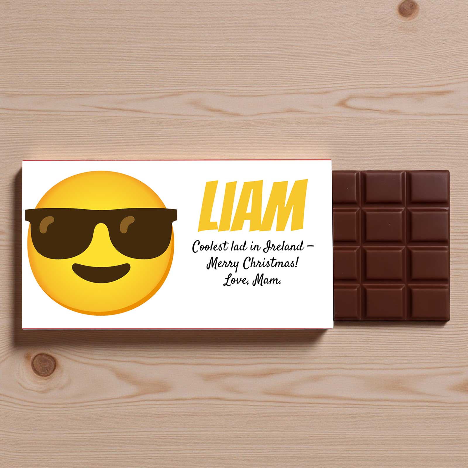Each chocolate bar is beautifully wrapped in a customised design featuring a fun emoji and your chosen message. Personalise it with a name and a heartfelt note to create a unique gift that'll warm hearts and bring smiles.
