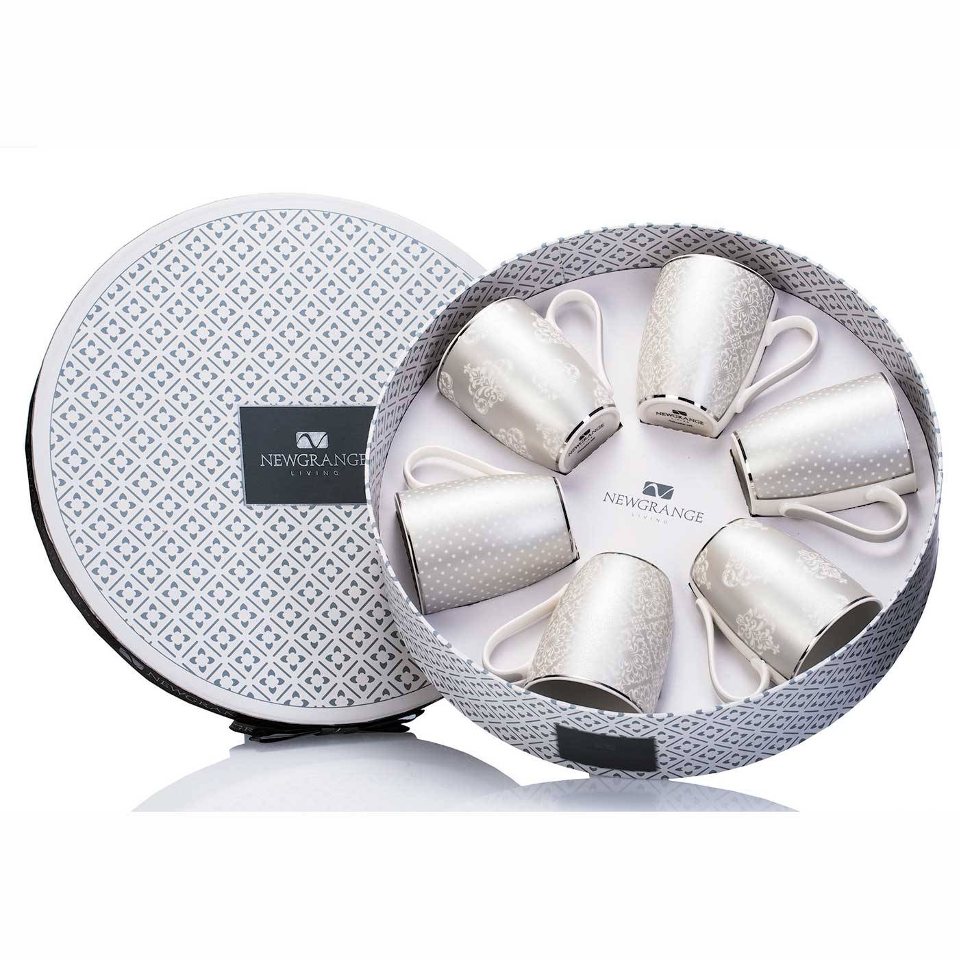An exclusive set of six silver bone china mugs in a circular gift box.