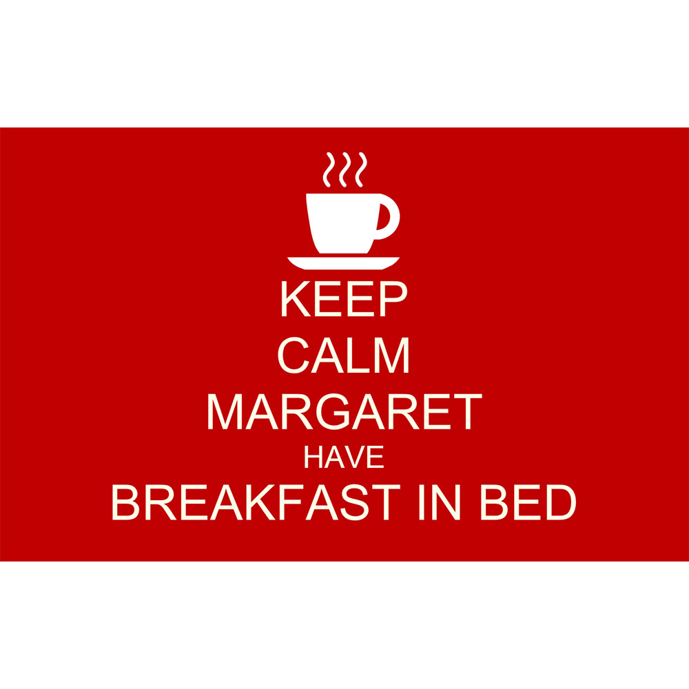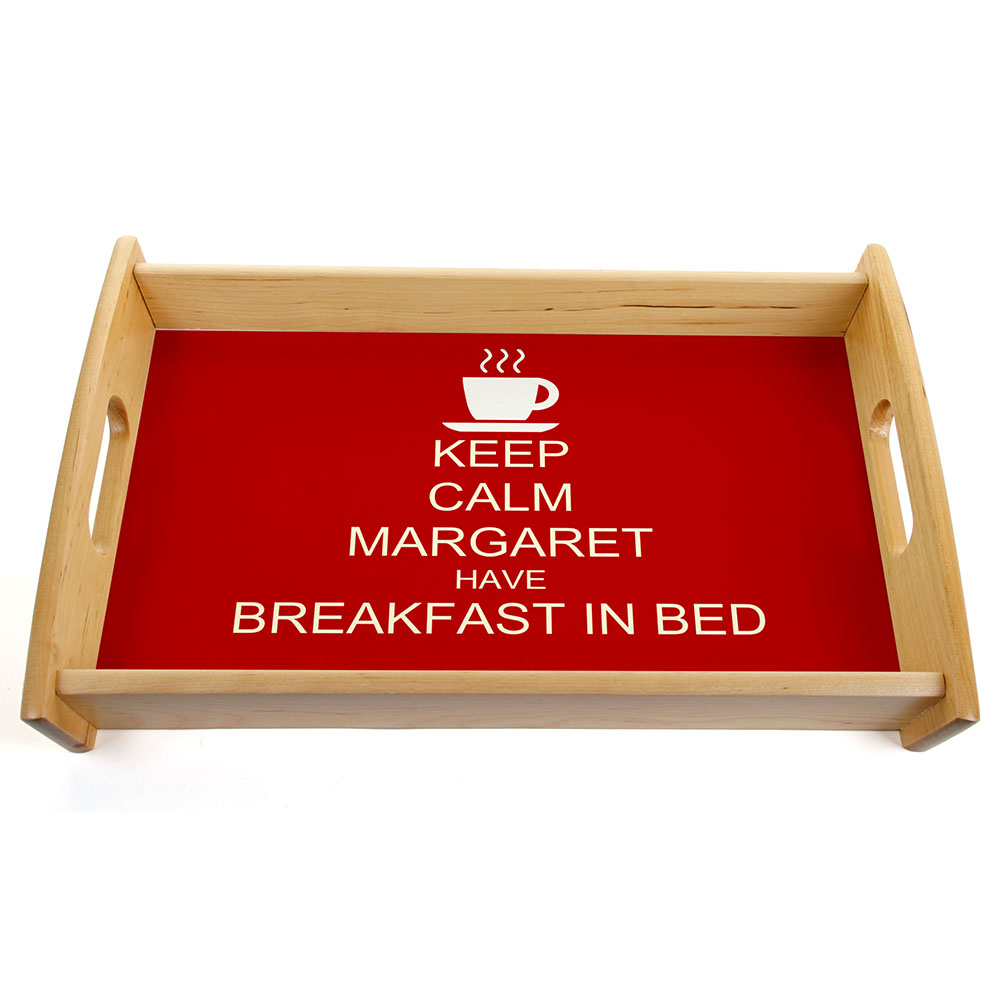 Your recipient's first name is printed on the tray i.e. "KEEP CALM [FIRST NAME] HAVE BREAKFAST IN BED".