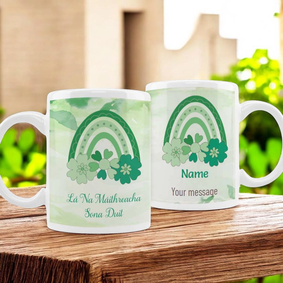 Brighten up a loved one's special day with this charming Lá Na Máithreacha Sona Duit personalised mug, beautifully crafted to honour the spirit of motherhood with a touch of Irish luck and love. Featuring a delightful green rainbow and shamrock design, this unique mug can be customised with a name and special message, making it a heartfelt gift that will be treasured every day.