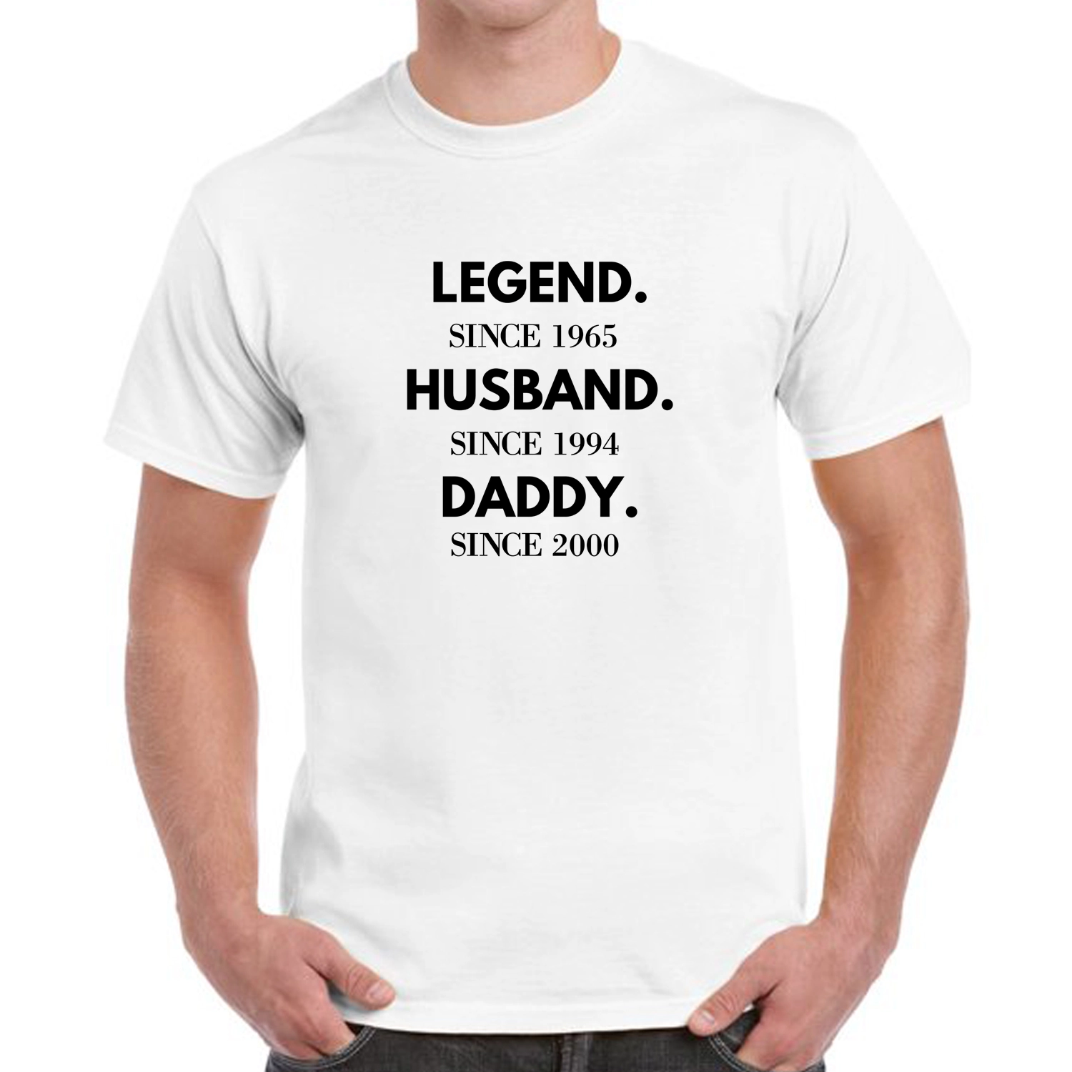 Celebrate the special man in your life with our 'Legend, Husband, Daddy Since [custom year]' Personalised T-Shirt. Customize it with the year he became a legend in your life. Whether it's the year he became a husband, a father, this shirt is the perfect way to show your love and appreciation for him. Made from high-quality and comfortable material, it's perfect for daily wear. Order now and give him a unique and special gift that he will treasure for years to come, personalise it with the year that holds a special date for him, and make it a perfect birthday, anniversary or Father's Day gift.