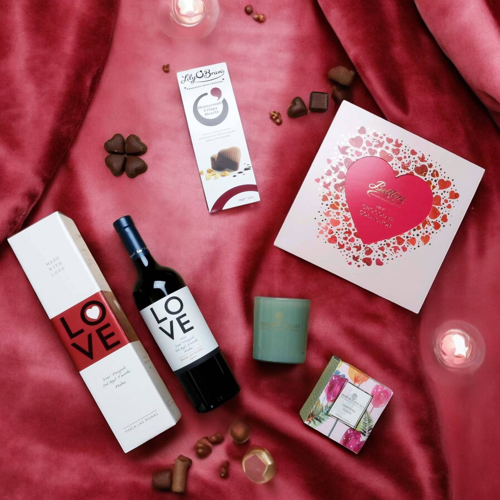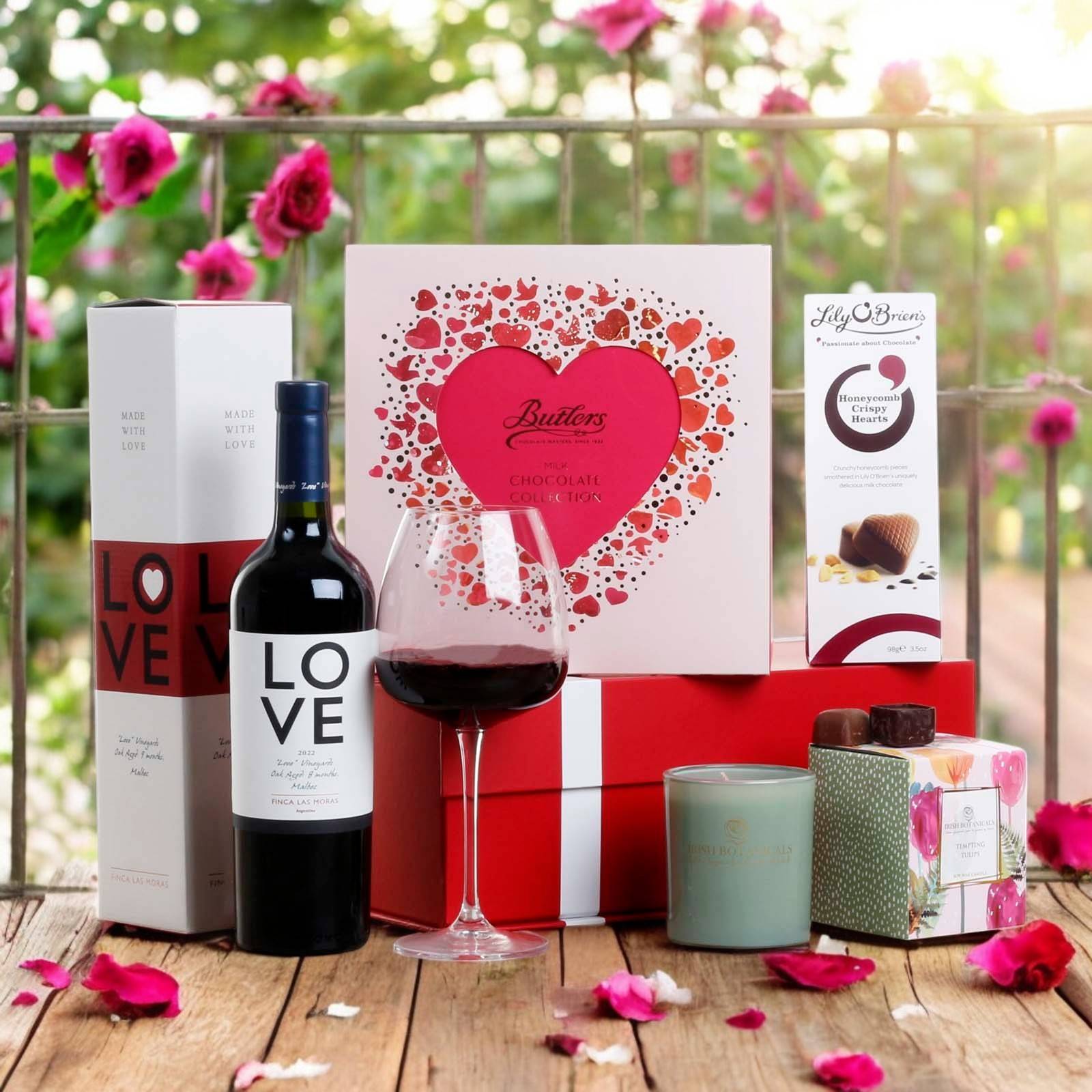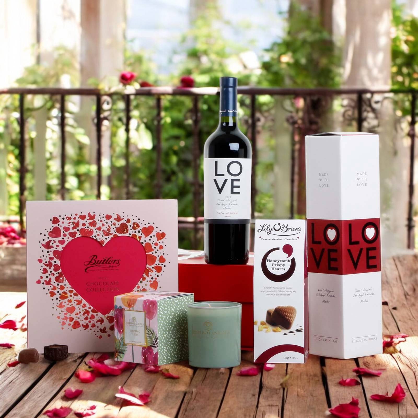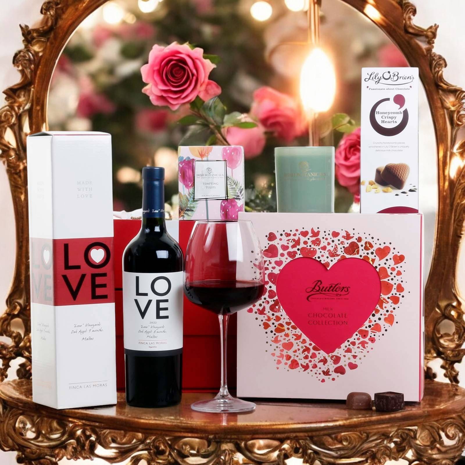 Featuring a bottle of Las Moras Love malbec wine, rich and full-bodied, a decadent box of Butlers Heart Motif truffle chocolates, a box of Lily O'Brien Honeycomb Crispy Heart chocolates, and an Irish Botanicals Tempting Tulips soy wax candle.