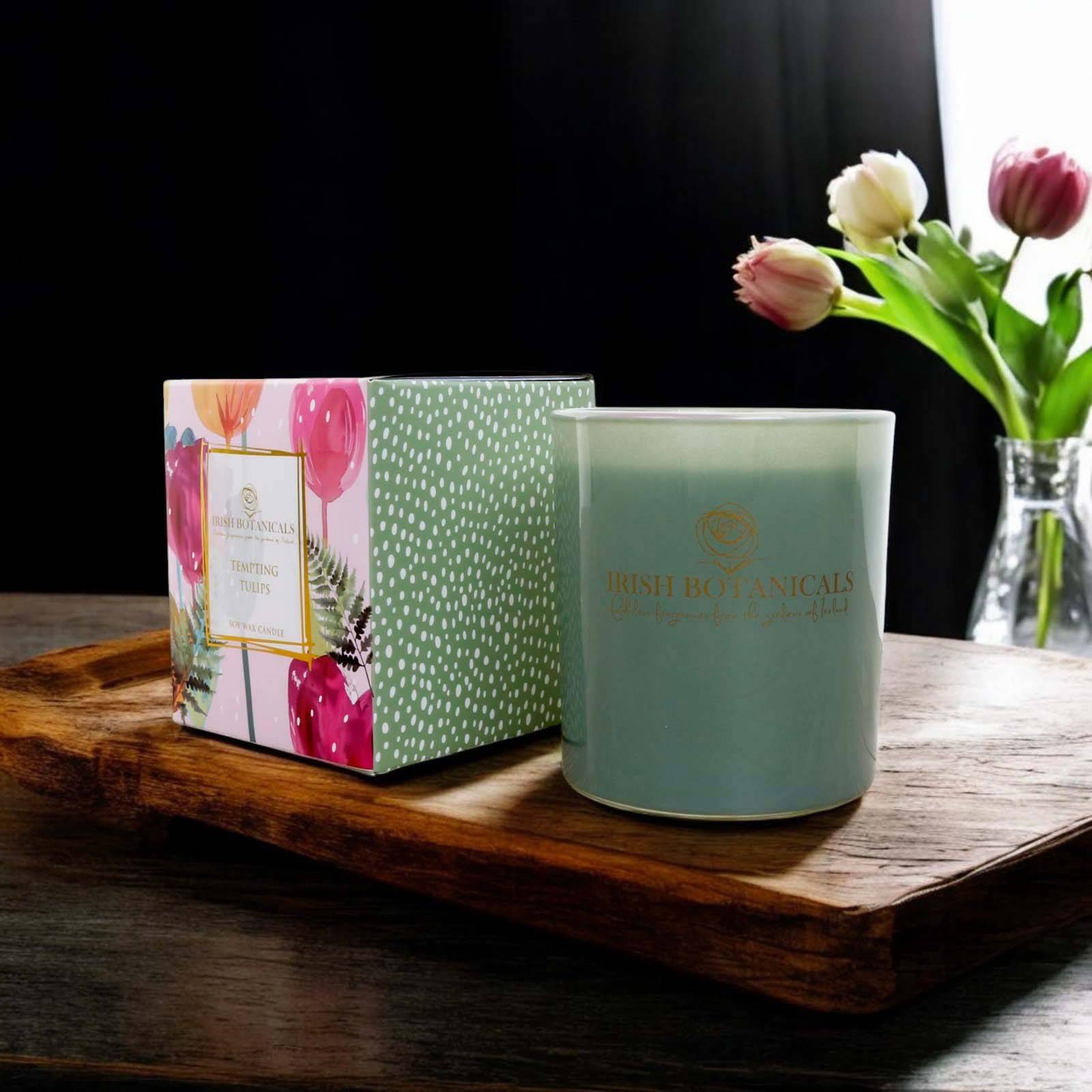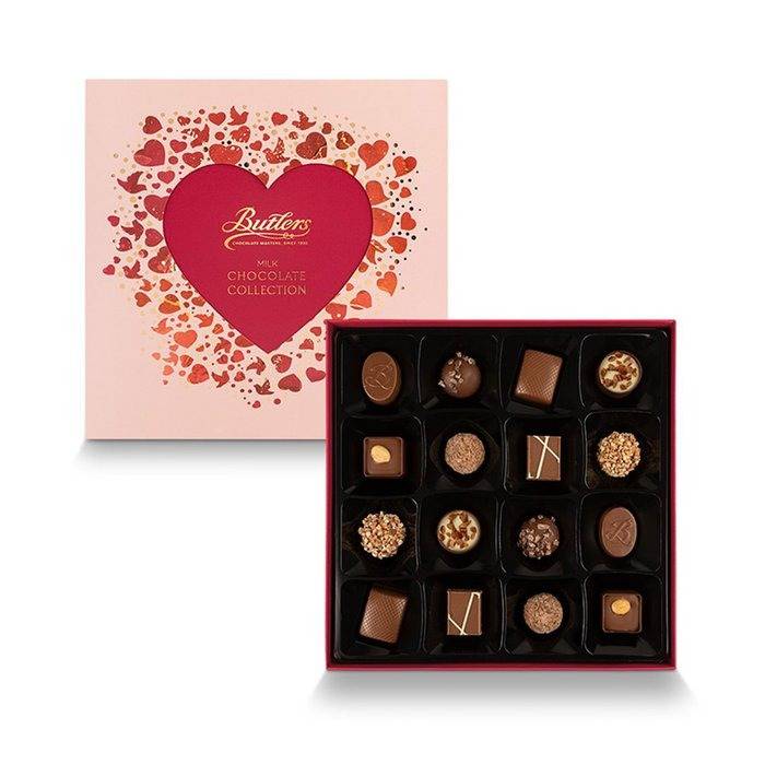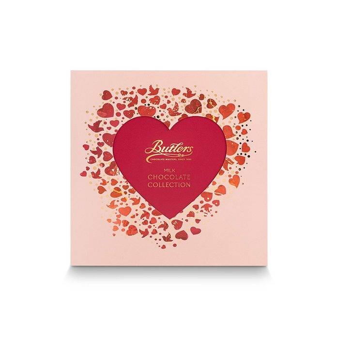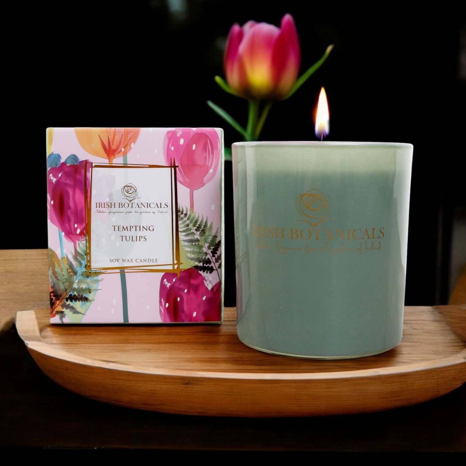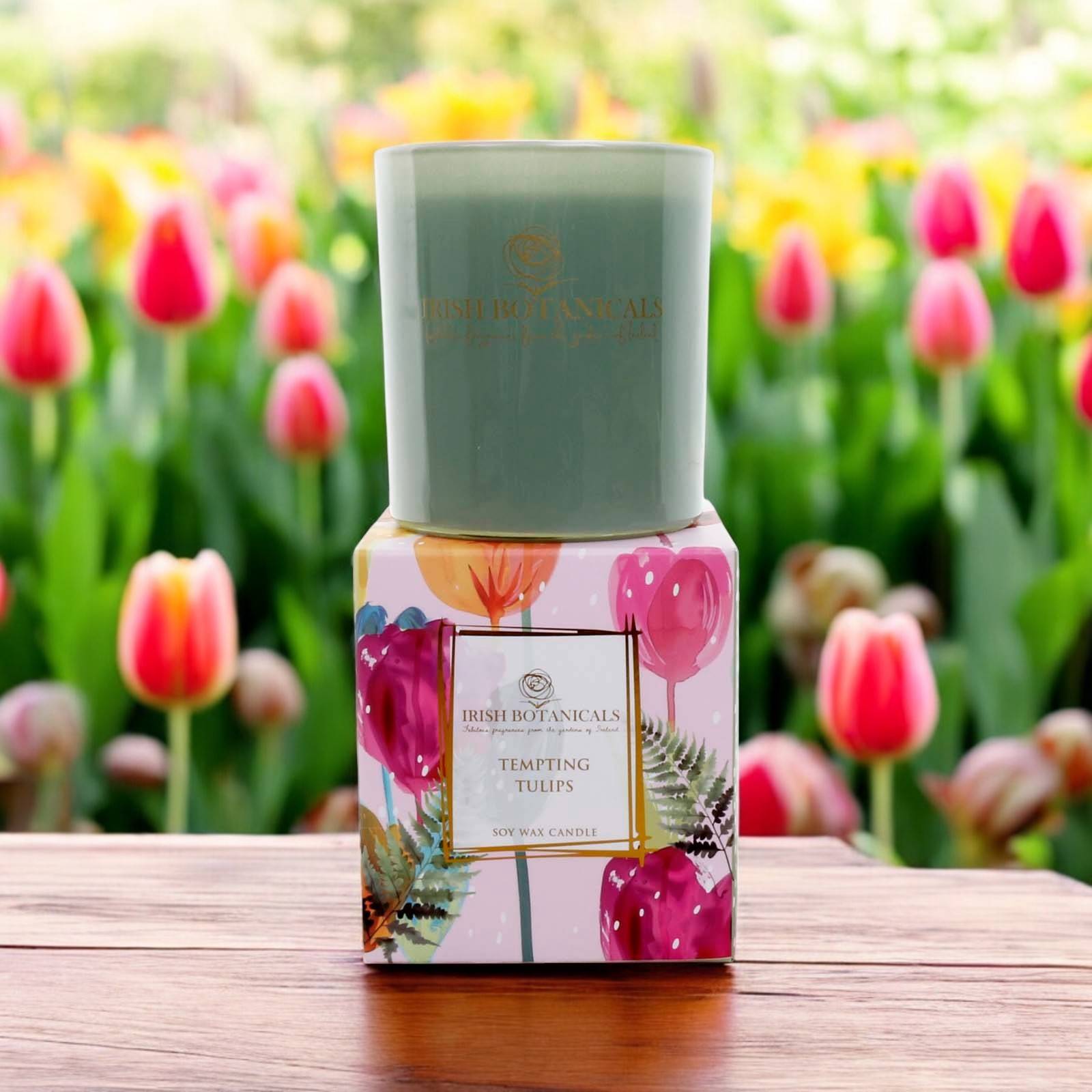 Featuring a bottle of Las Moras Love malbec wine, rich and full-bodied, a decadent box of Butlers Heart Motif truffle chocolates, a box of Lily O'Brien Honeycomb Crispy Heart chocolates, and an Irish Botanicals Tempting Tulips soy wax candle.