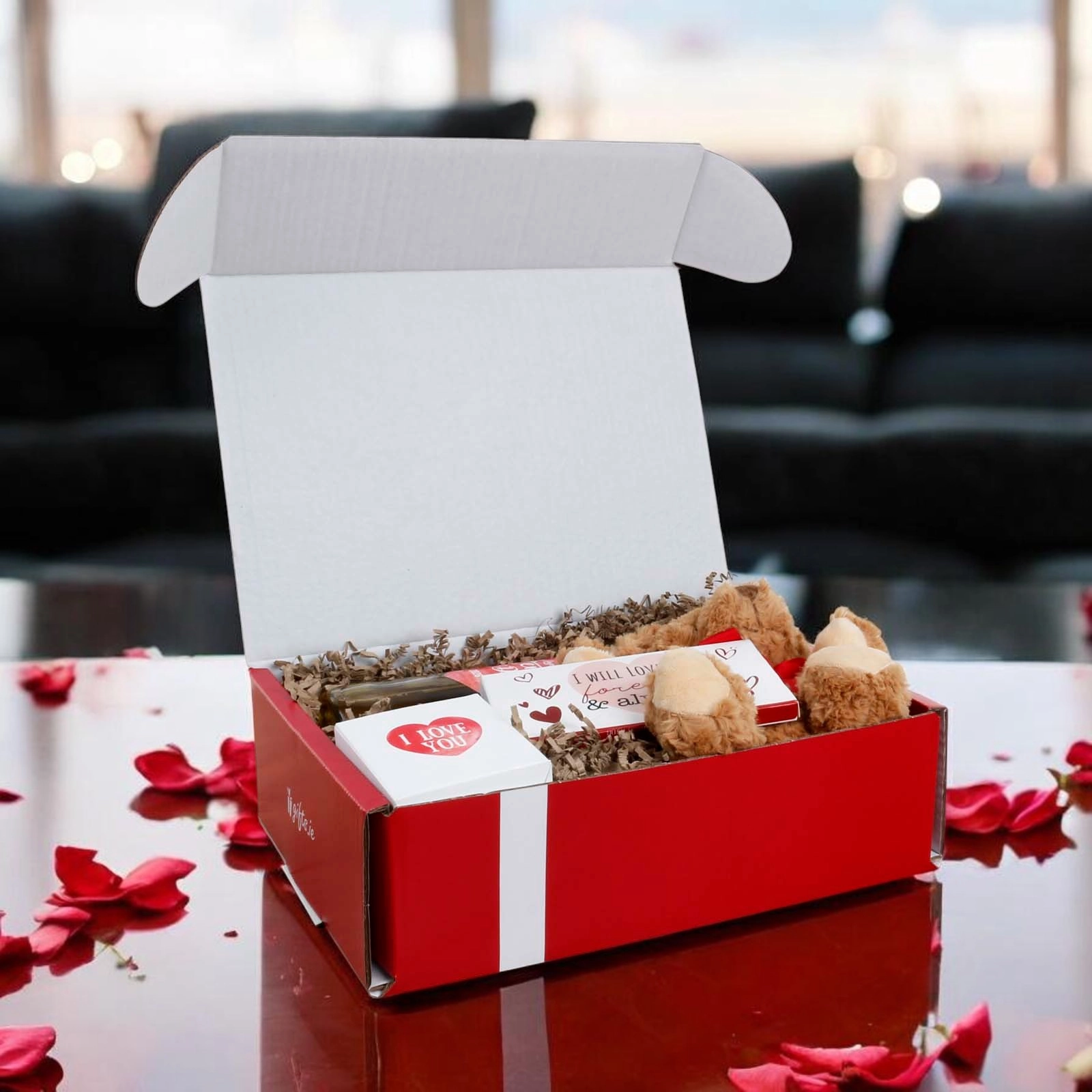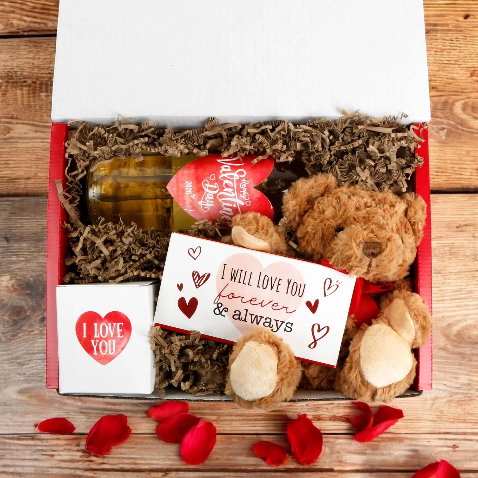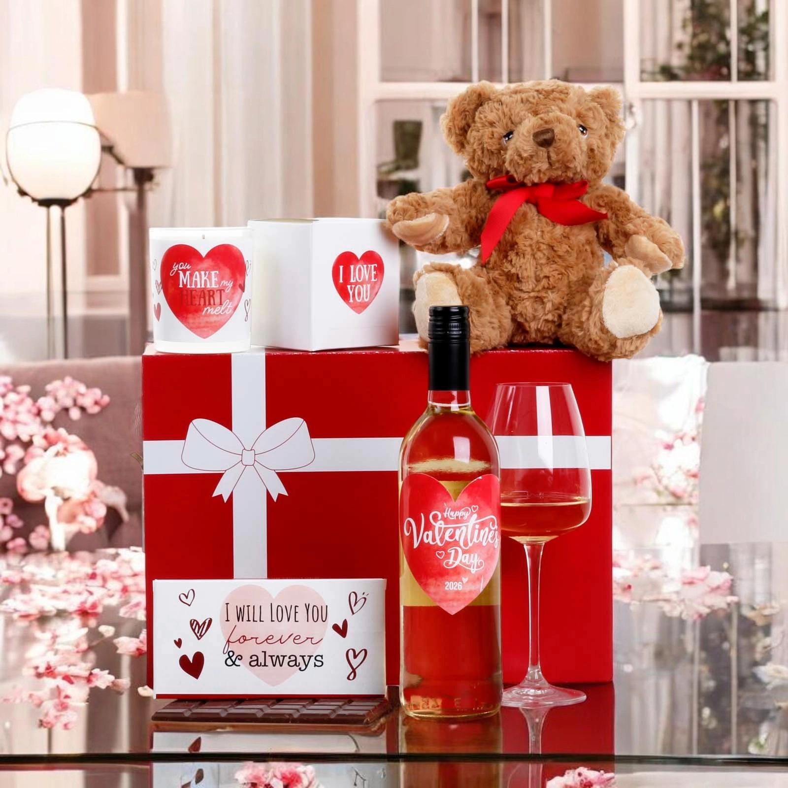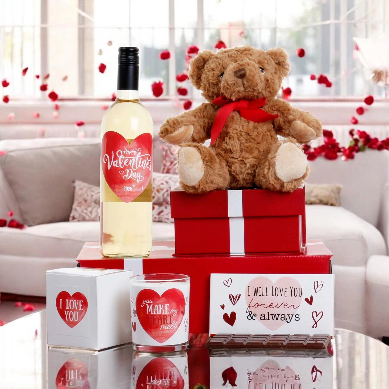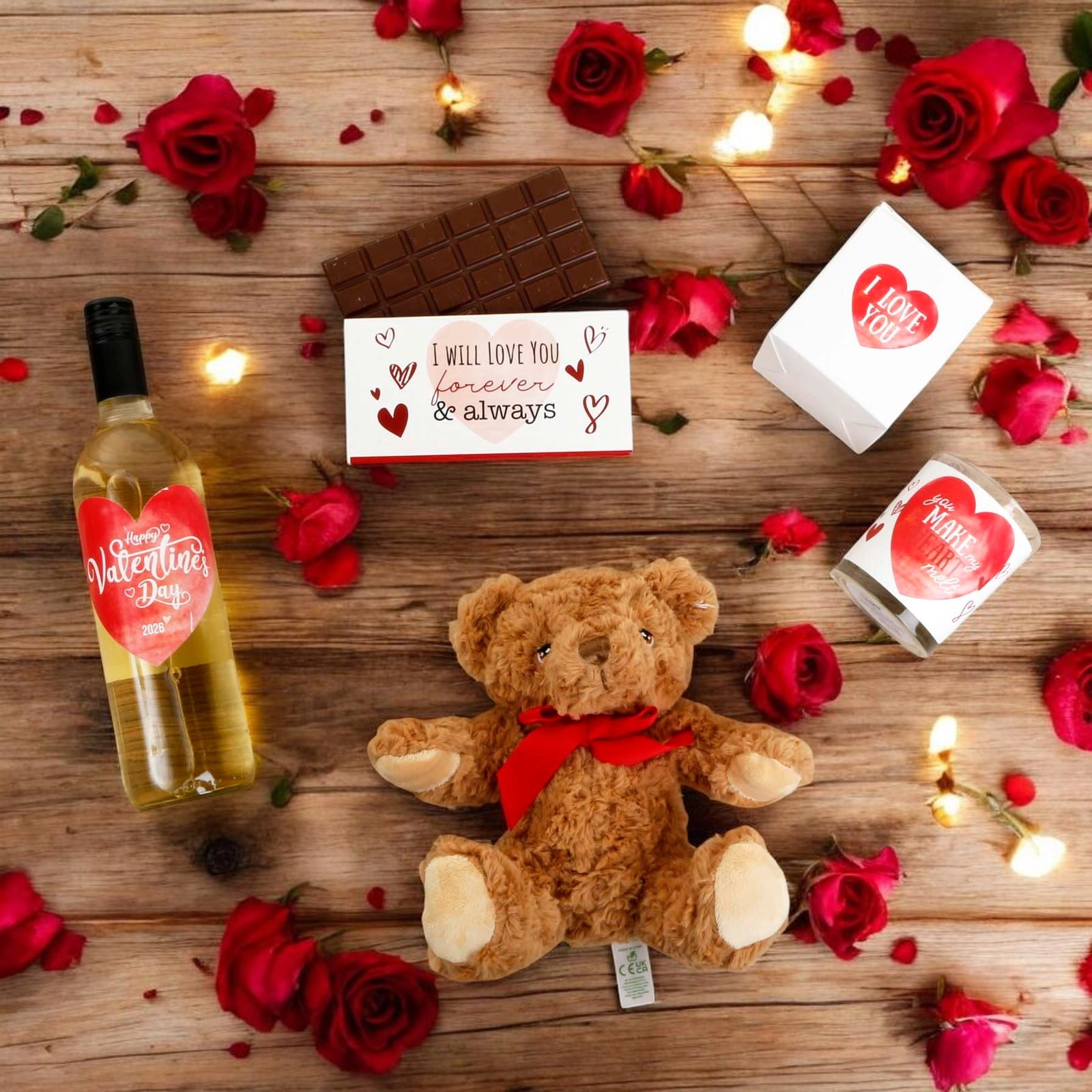 Celebrate love in style with this perfectly curated hamper. Inside, you’ll find a personalised bottle of exquisite white wine, a soft and cuddly teddy bear, a decadent Valentine’s chocolate bar, and a Valentine's scented candle to set the mood.