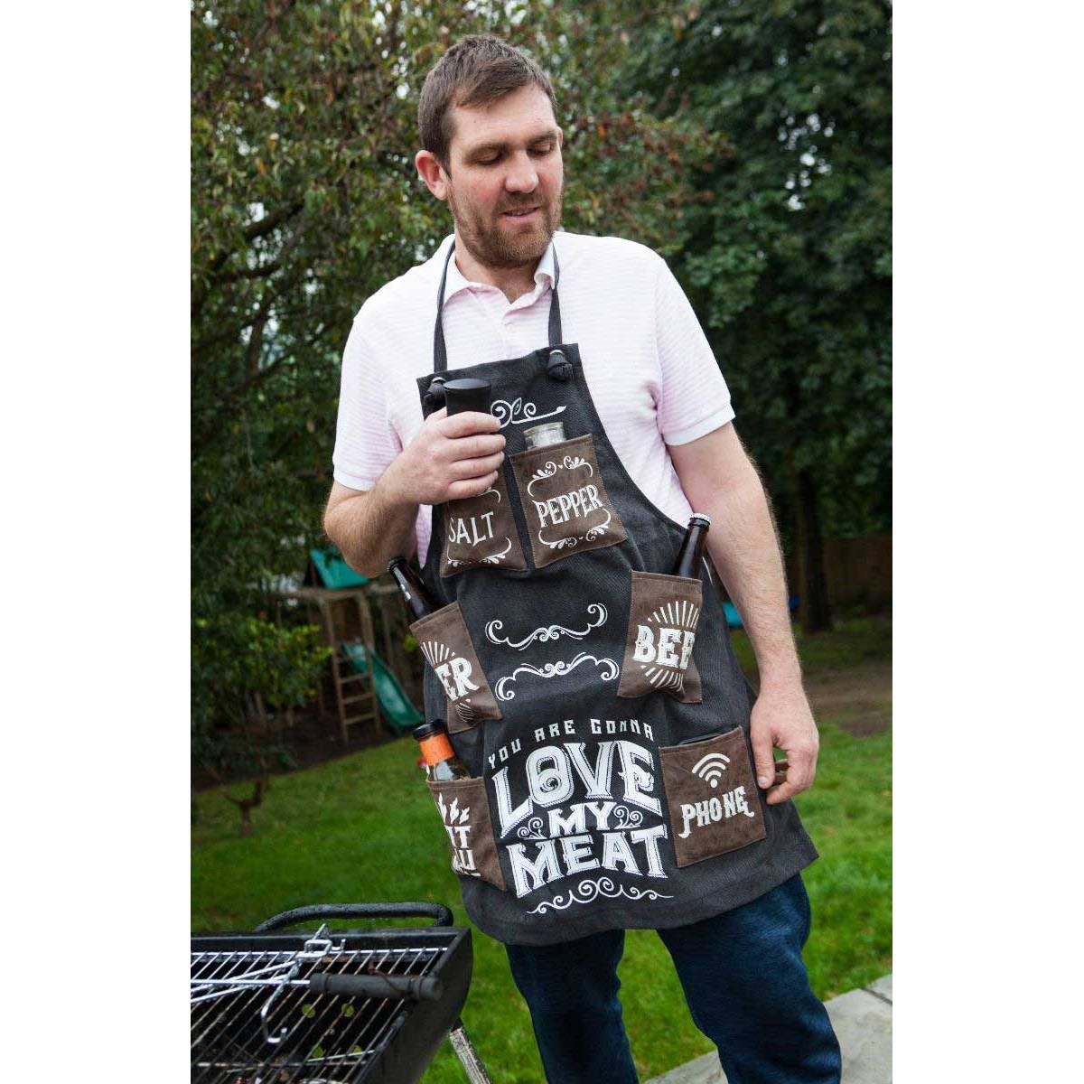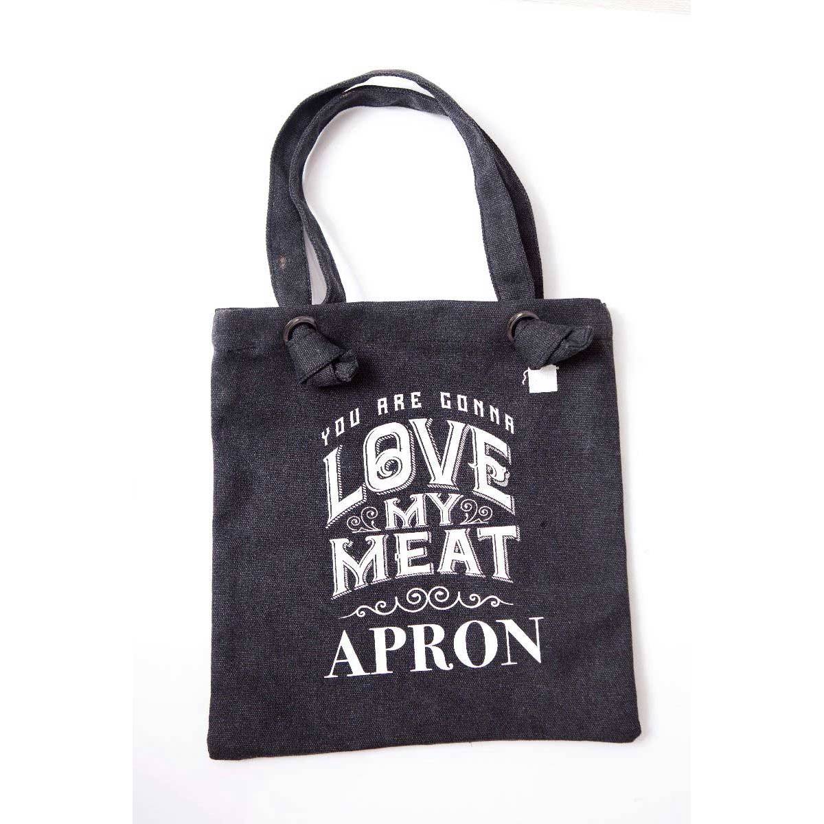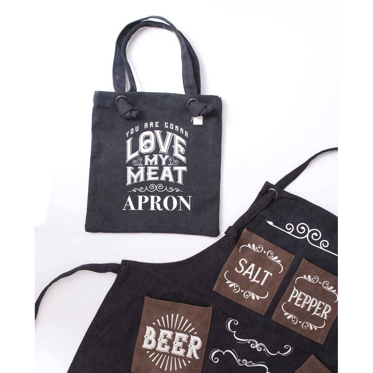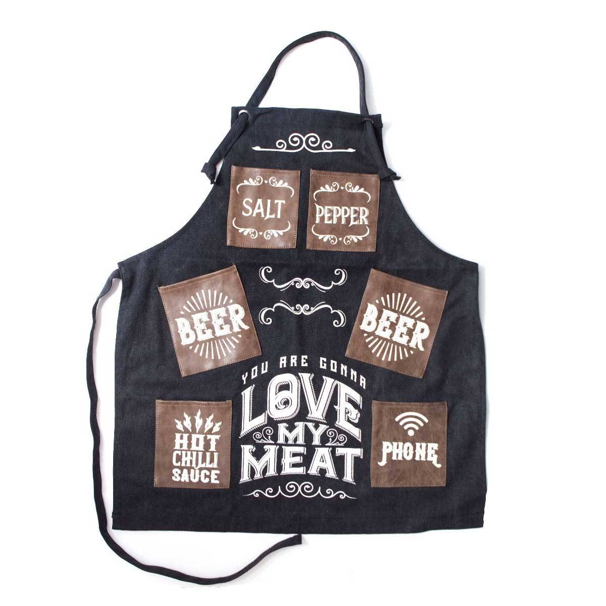 Know somebody who's extremely proud of their meat? Whether it's a sausage, steak or pork chop, let everybody know who the "king of the kitchen" is with this hilariously stylish yet sturdy apron. Heavy duty black canvas fabric, with classy white print that reads "You Are Gonna Love My Meat", this novelty man’s cooking apron is perfect for barbecues in the sun! Six brown Leatherette pockets help the manly owner of this apron carry his valuables (salt, pepper, hot chilli sauce, phone and two beers), while still maintaining ultimate manliness! Complete with a black canvas shopper bag and gift tag (perfect for a trip to the butchers), this is the perfect gift for a hungry husband, dapper Dad or food fanatic on his birthday, father’s day Christmas or an everyday buy. Who wants another hotdog?