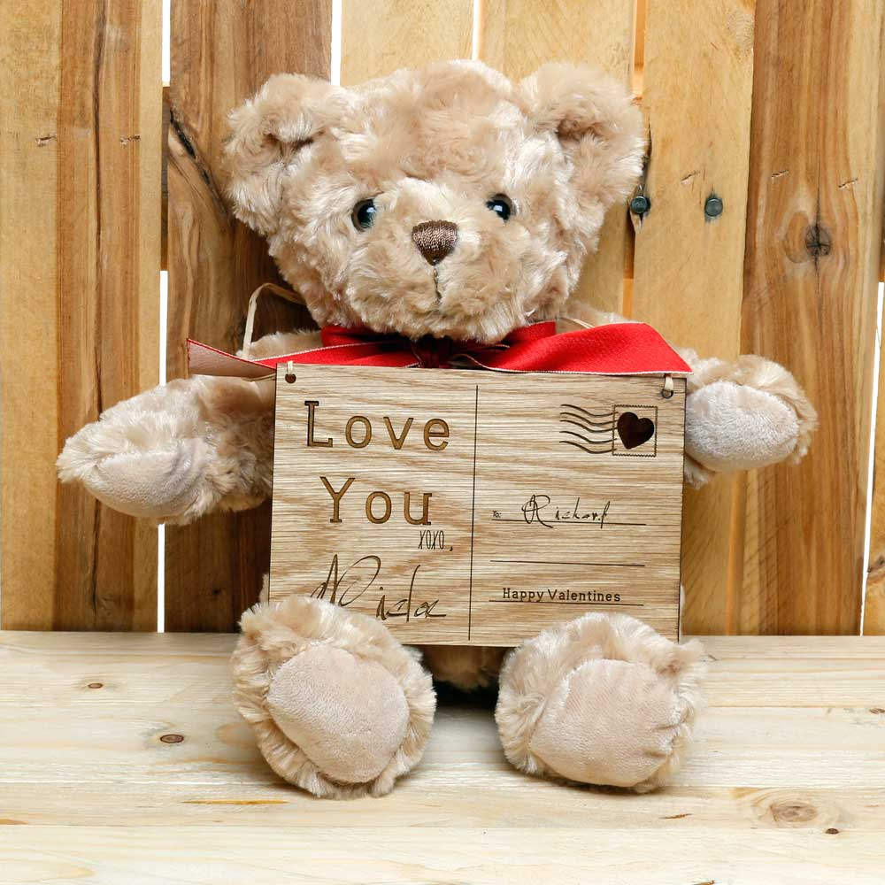 The bear is 25cm in height and the postcard 15cm x 10cm x 3mm.