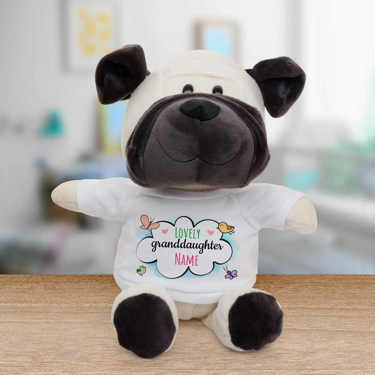 The animal's t-shirt is personalised to include your special message.