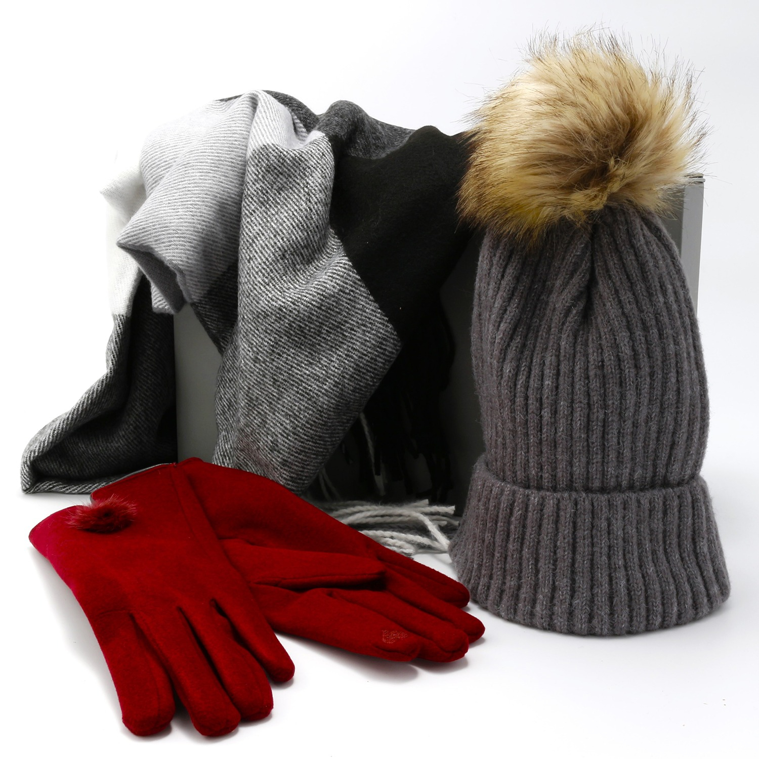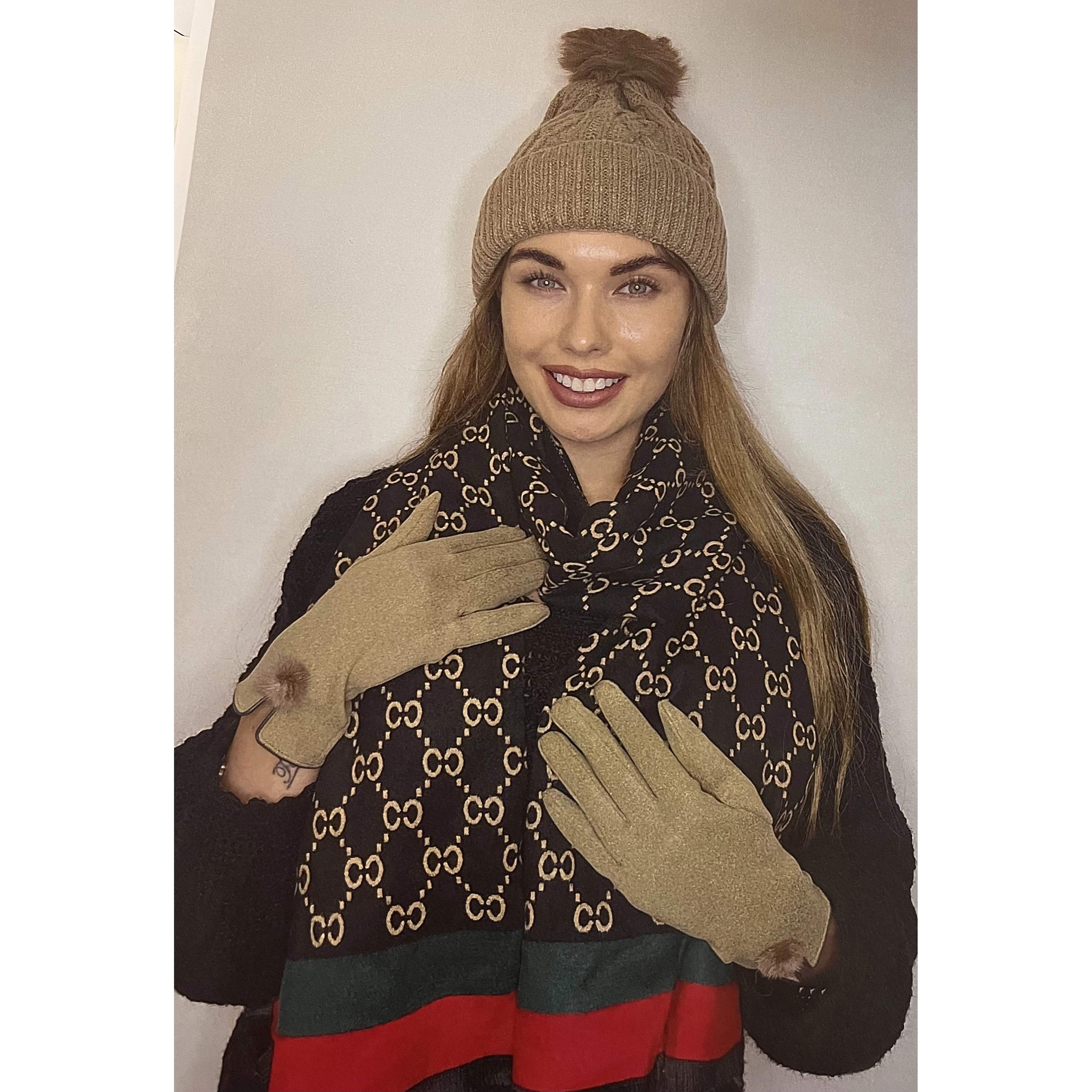 Wrap someone special in warmth and festive cheer with this exquisite winter gift set. Featuring a beautifully patterned scarf in striking black, red, green, and cream tones, paired with a matching cream hat and soft caramel gloves, this set is designed for ultimate winter comfort and style.