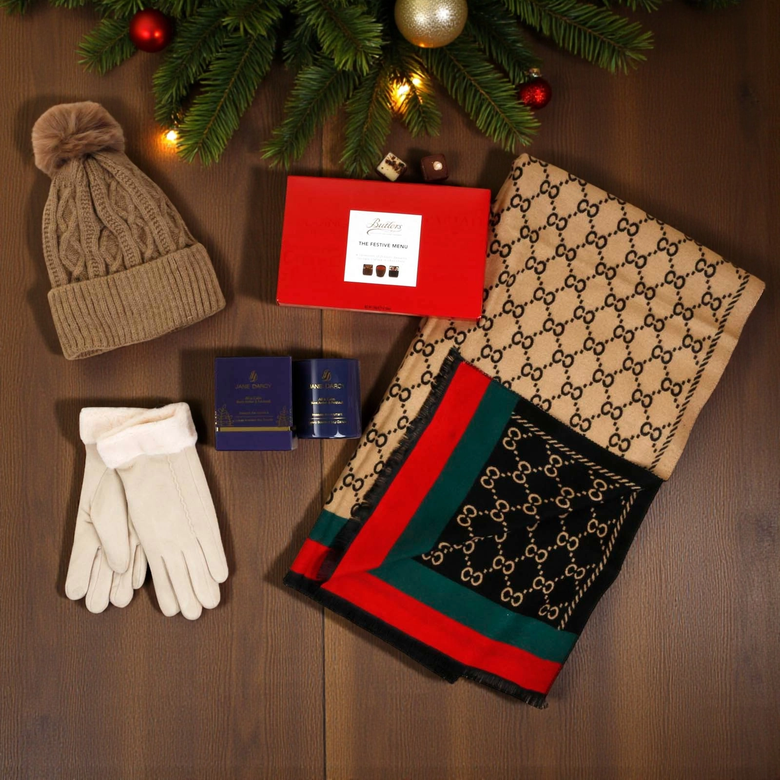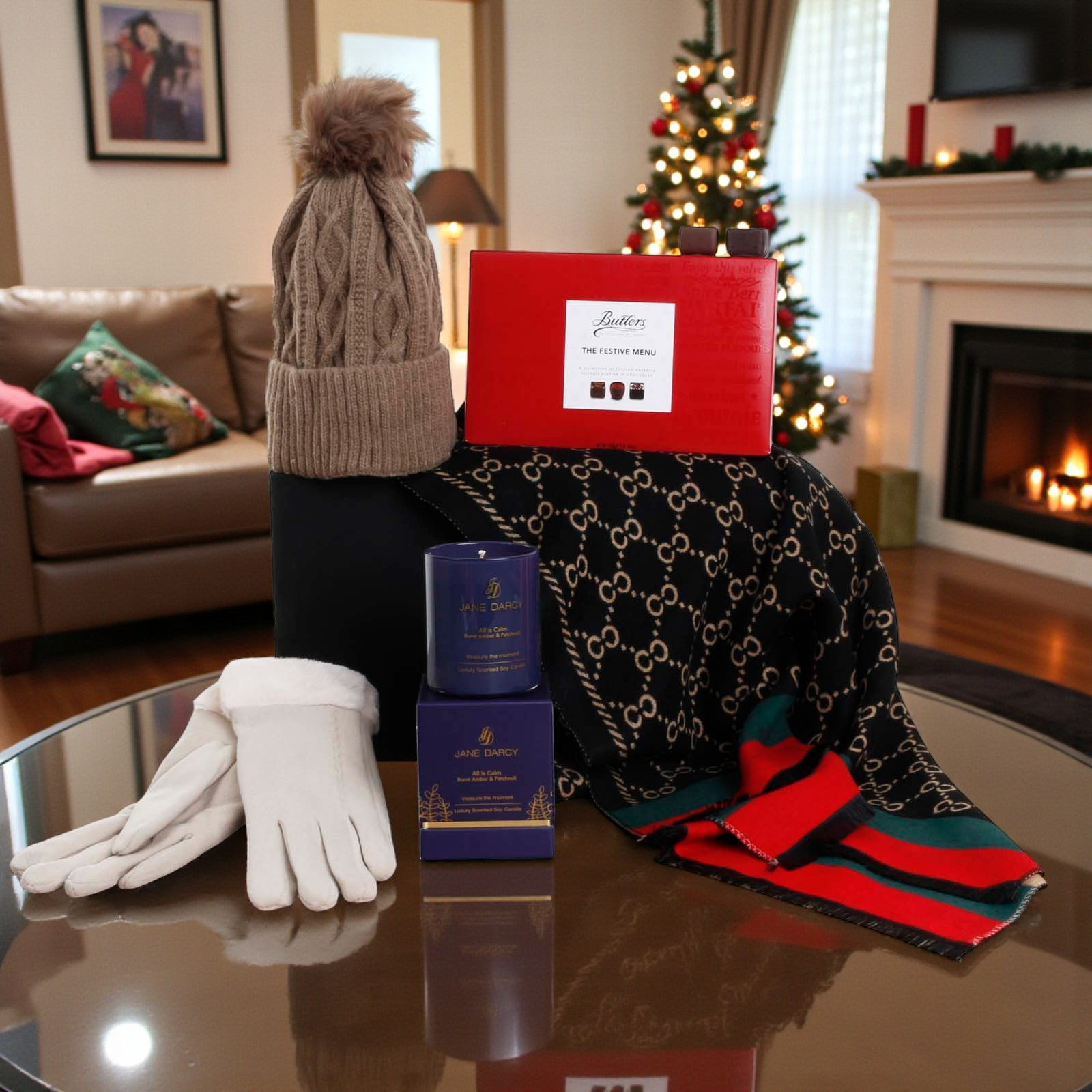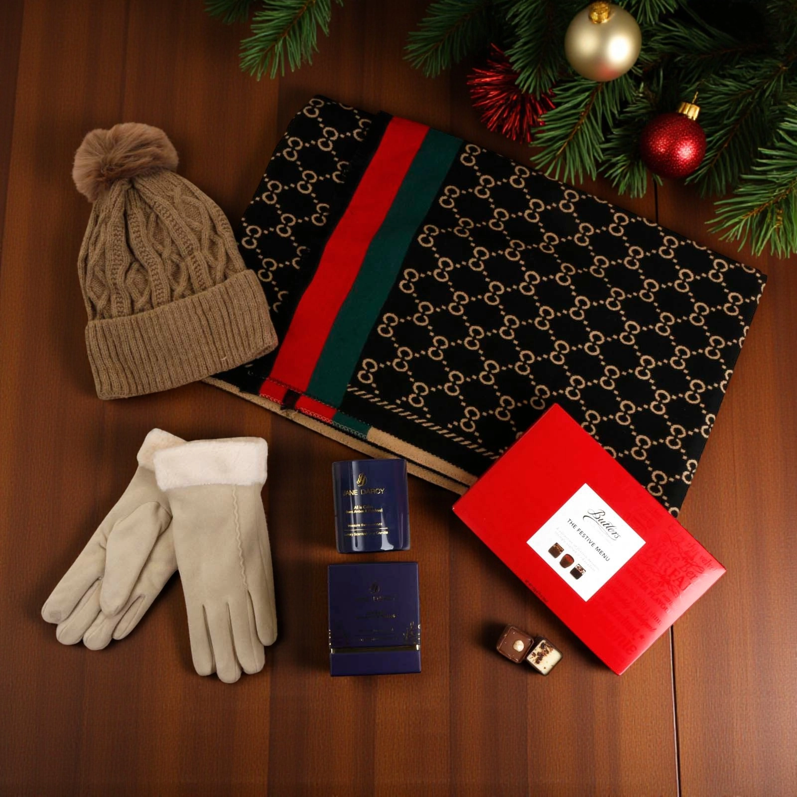 Luxury Cosy Scarf, Candle & Chocs Set – Black, Green, Red & Cream