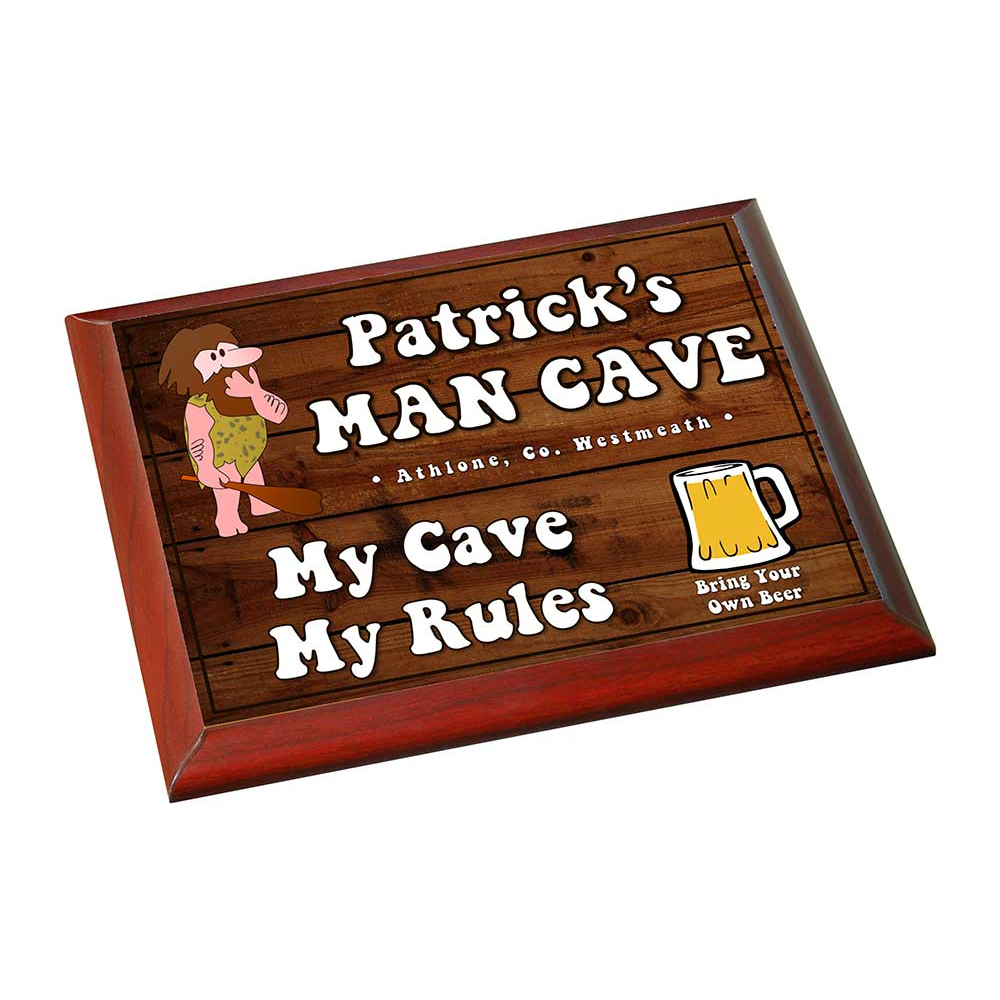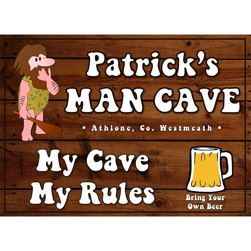 The sign is personalised with his name and the cave's location (Town & County).