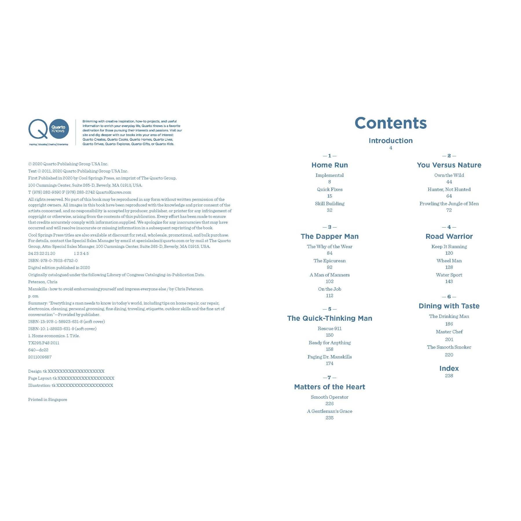 Manskills covers everything a man needs to know in today's world. You'll find essential tips on home repair, car repair, electronics, cleaning, personal grooming, fine dining, traveling, etiquette, outdoor skills, and the fine art of conversation. It's your comprehensive guide to impressing the masses! Author Chris Peterson returns with even more tips, tricks, and all the core knowledge the modern man is looking for. In the all-new edition of Manskills, you'll find page after page of tried-and-true information for every aspect of life.