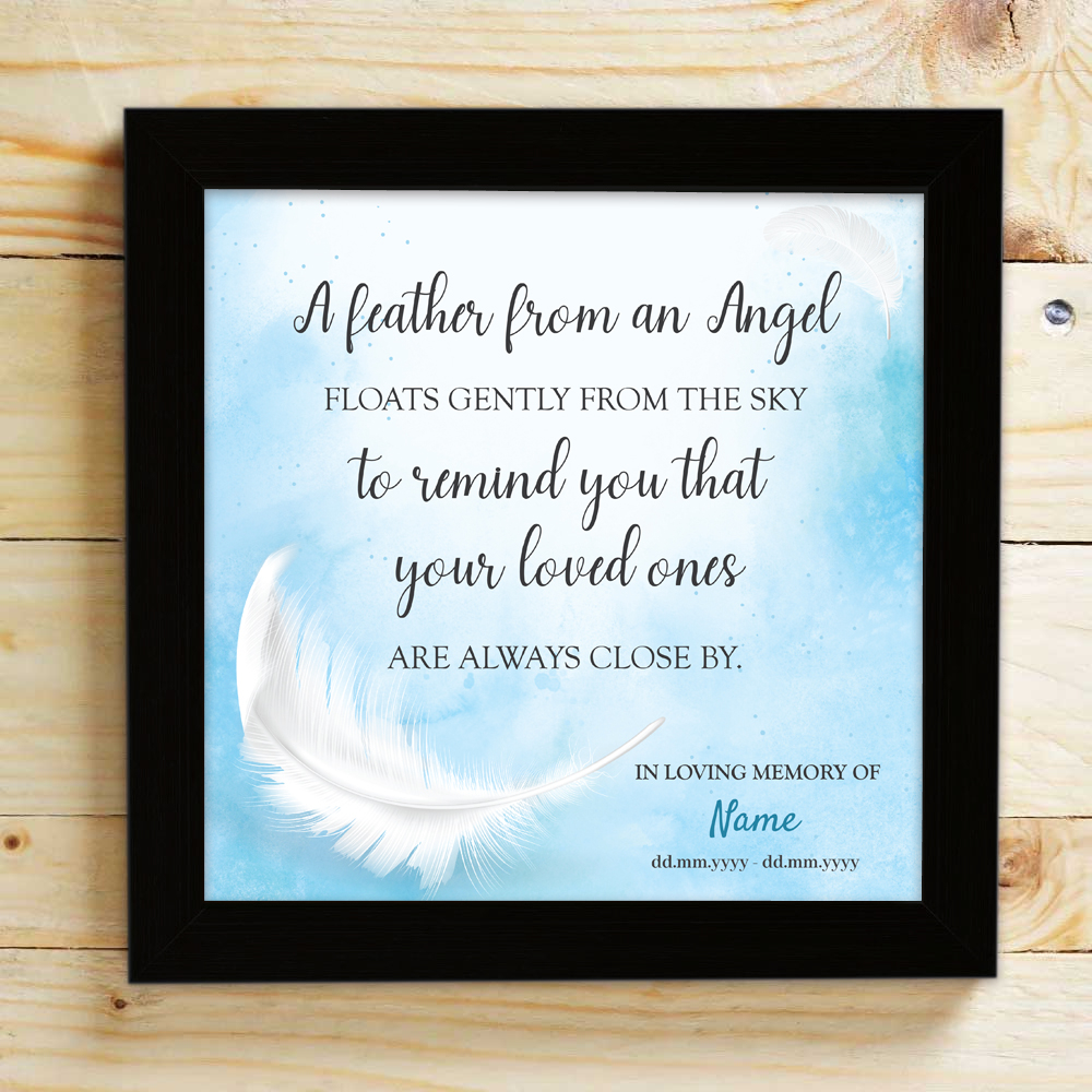The Personalised Box Frame with the memorial poem "A feather from an angel floats gently from the sky to remind you that your loved ones are always close by" is a sentimental way to remember a loved one who has passed away.