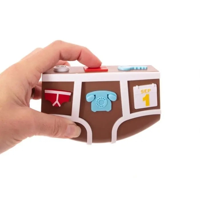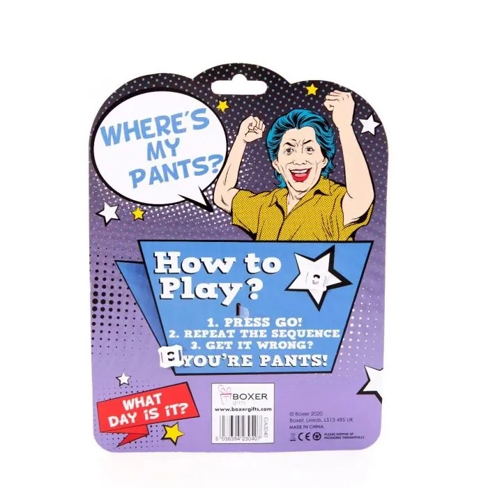 Follow the sequence by pressing the correct buttons in the right order. With five game buttons (Pants, Phone, Key, Wallet and Calendar) and a GO! button, show them you're not yet past it with this hilarious handheld game!