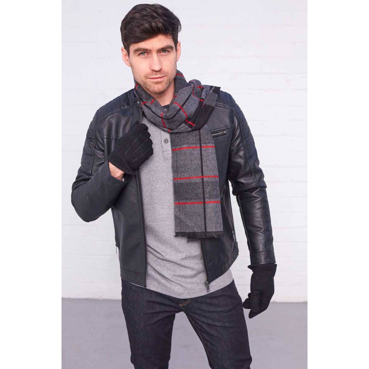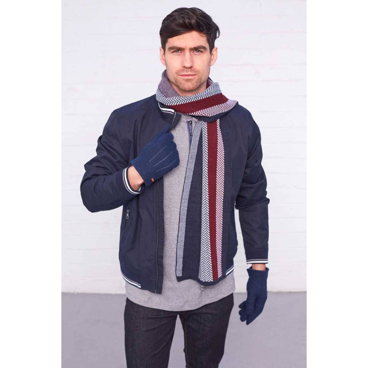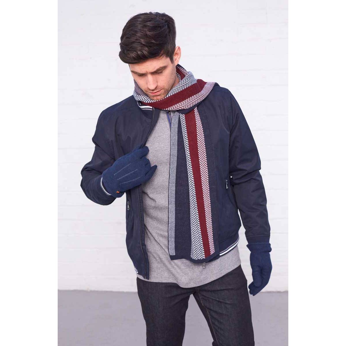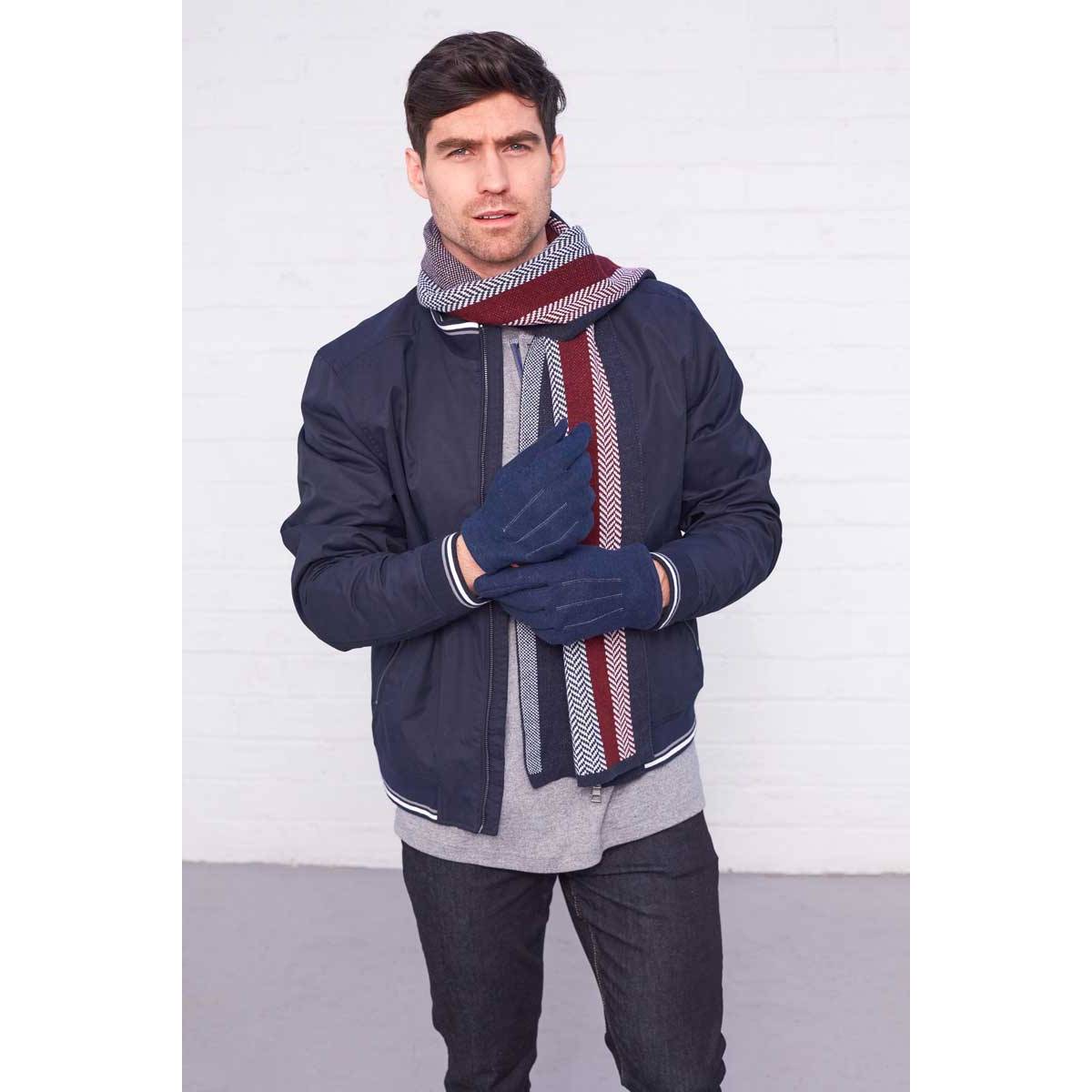 Choose from Navy & Red Striped Scarf & Grey Gloves or Black & Grey Scarf & Black Gloves.