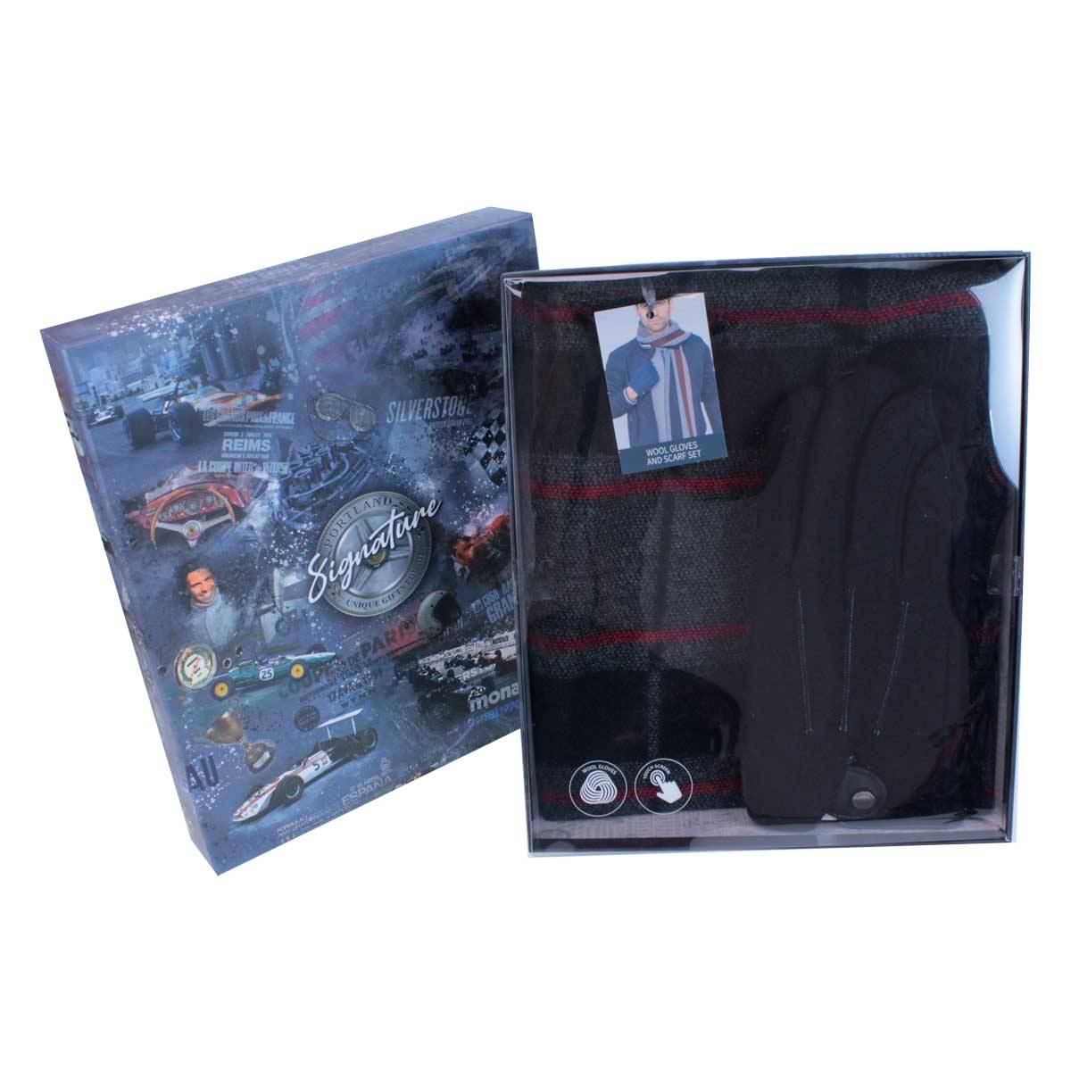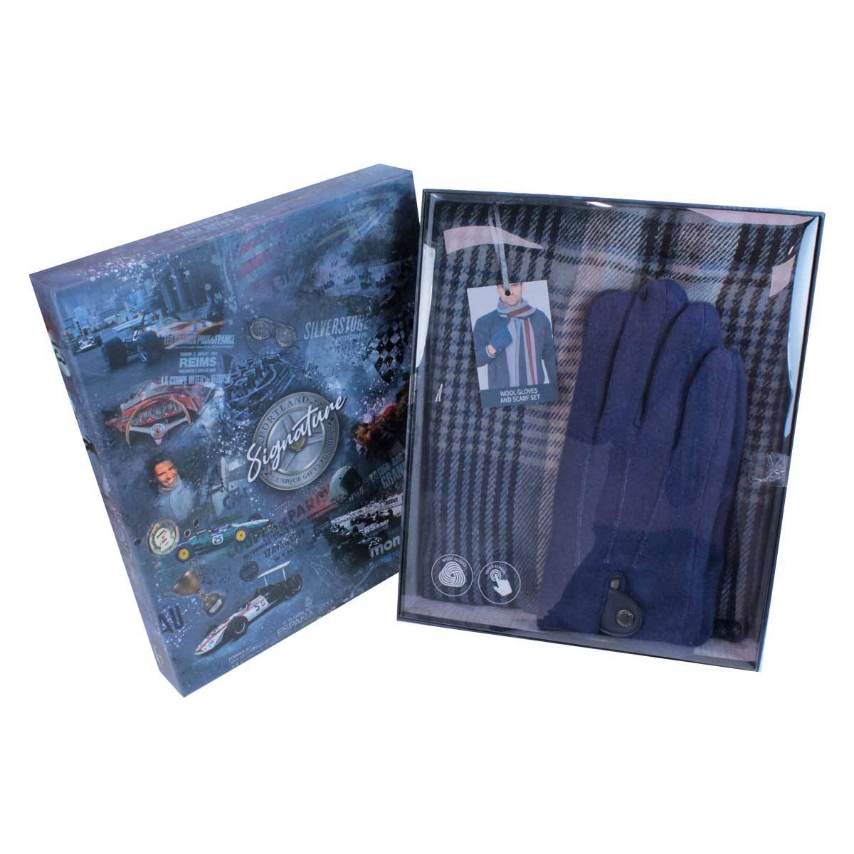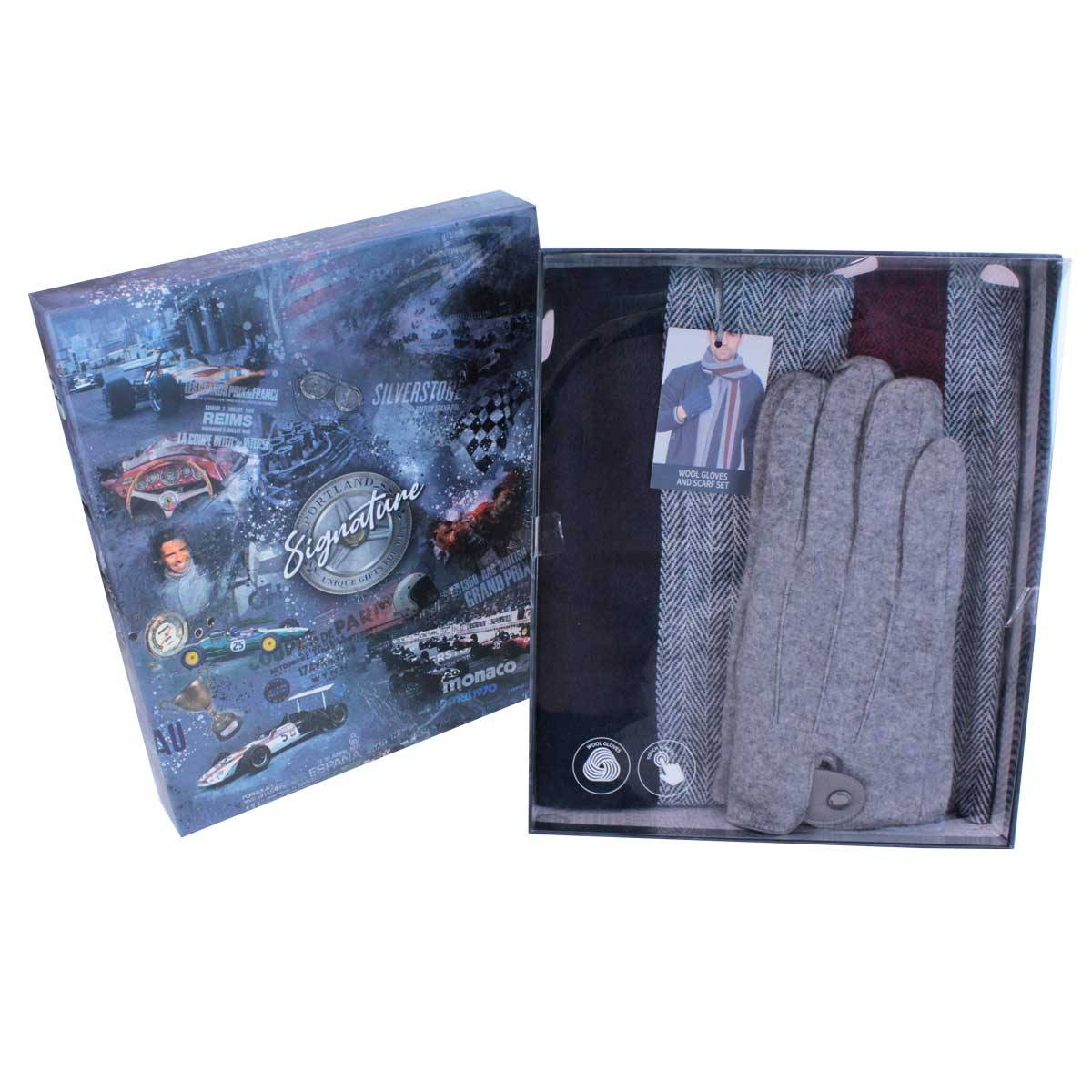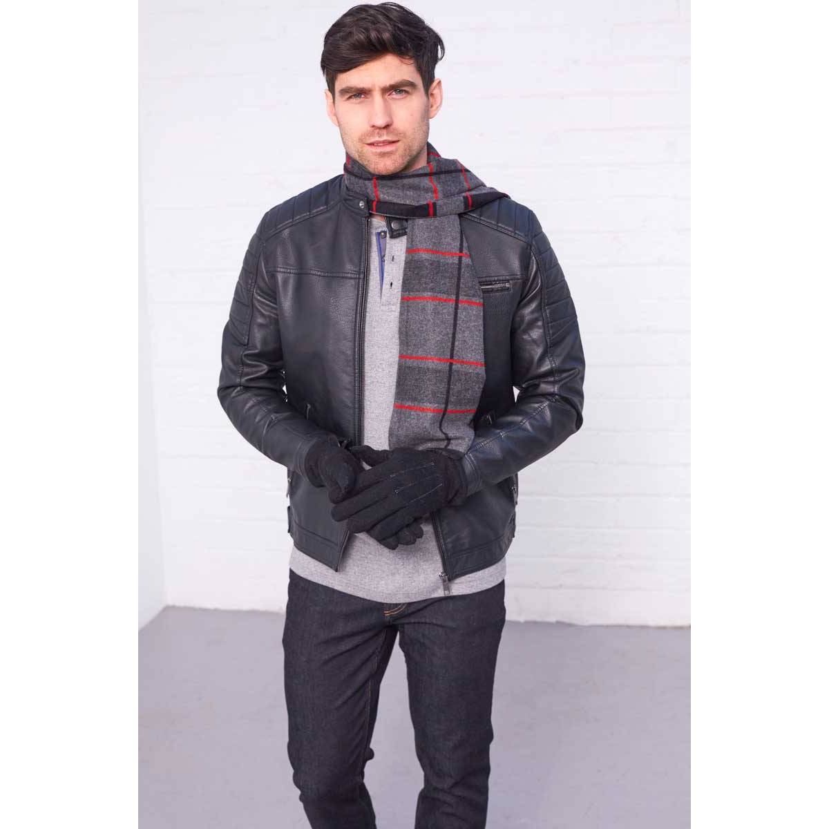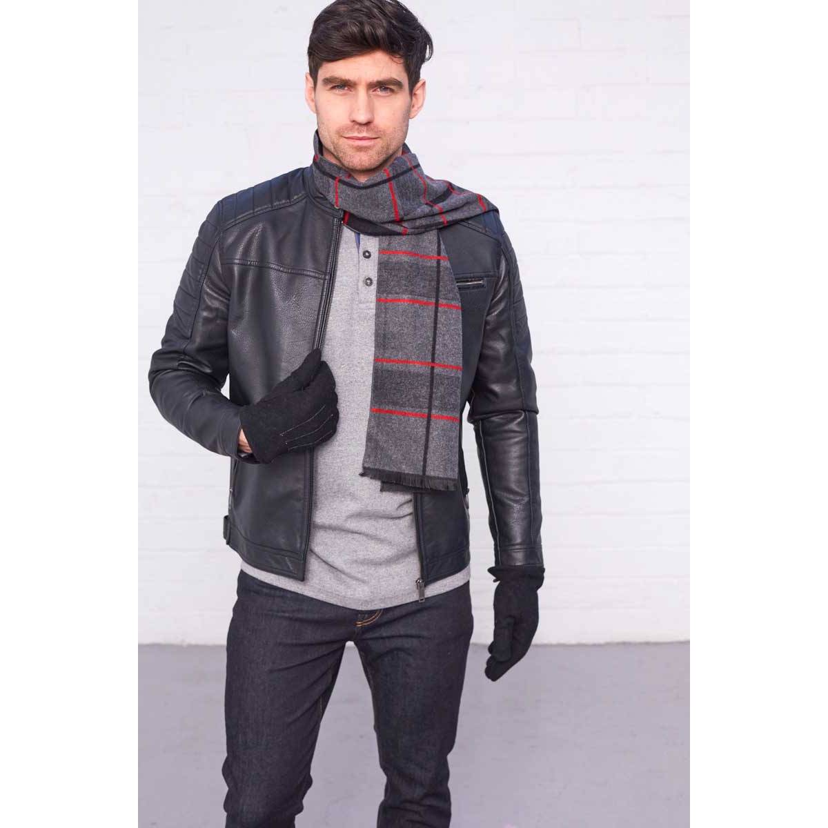 Choose from Navy & Red Striped Scarf & Grey Gloves or Black & Grey Scarf & Black Gloves.