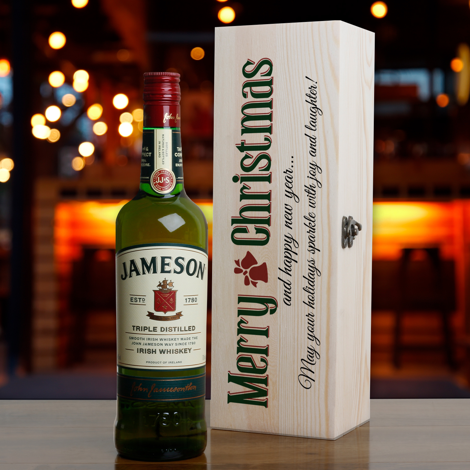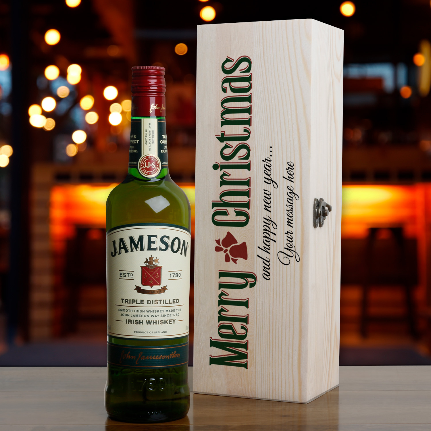 This personalised wooden box with a bottle of whiskey makes the perfect Christmas gift idea.