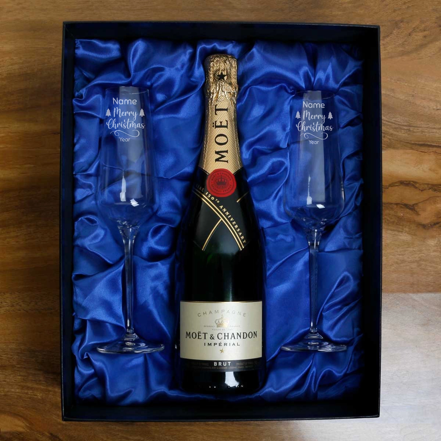 The contemporarily designed 180ml flutes along with the bottle of your choice are fitted into the satin-lined rigid gift box - a great keepsake.
