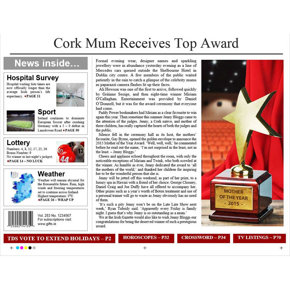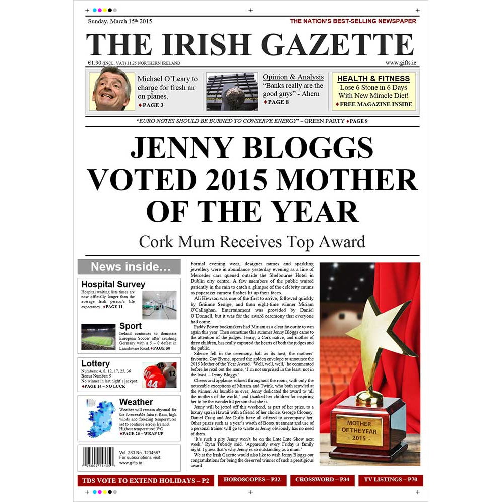 Headline: JENNY BLOGGS VOTED 2013 MOTHER OF THE YEAR