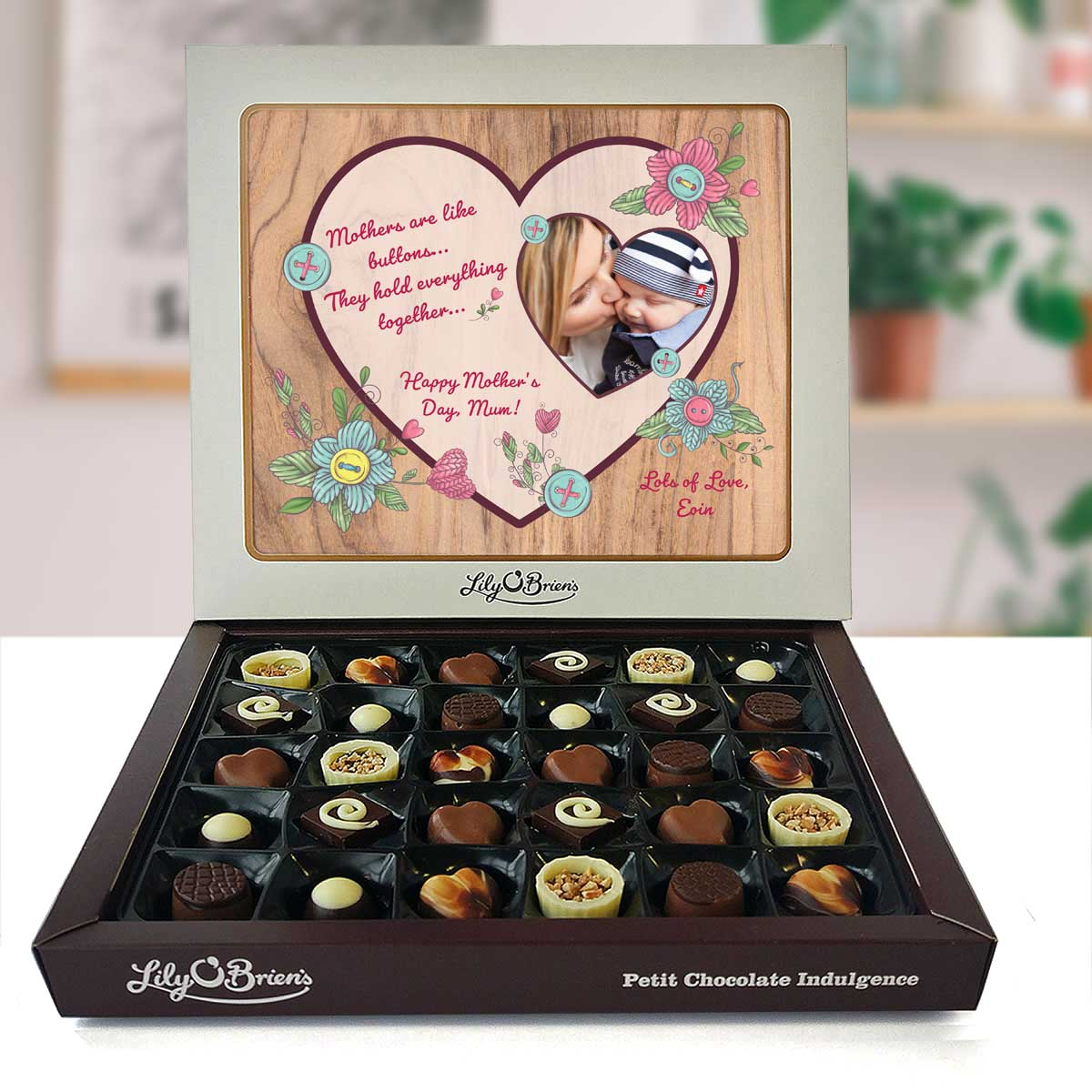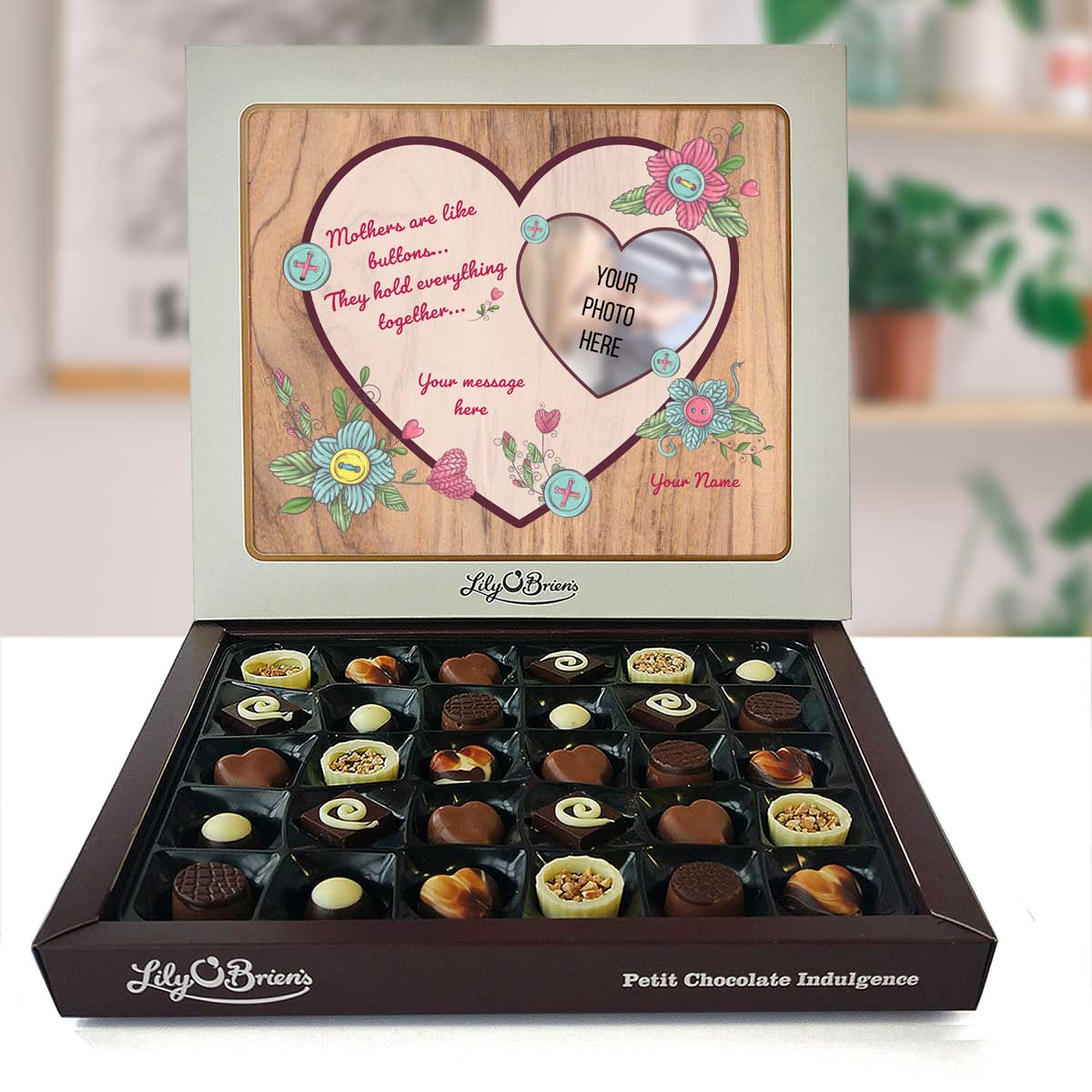 This Personalised Chocolate Box is filled with the Lily O'Brien's Luxury Chocolate collection. Approximate box dimensions: 290mm x 240mm x 40mm.