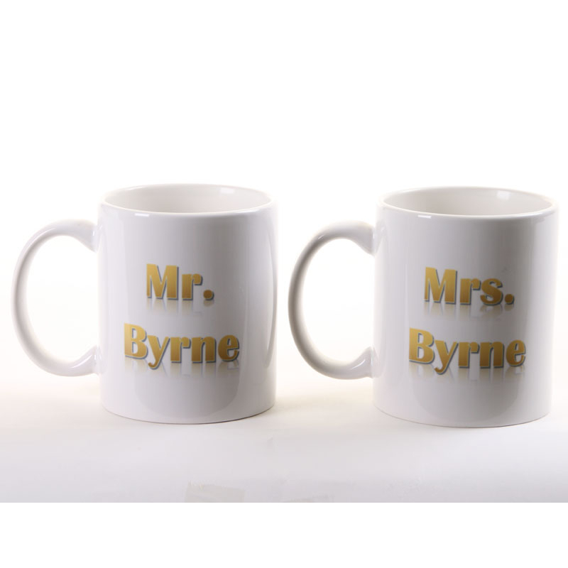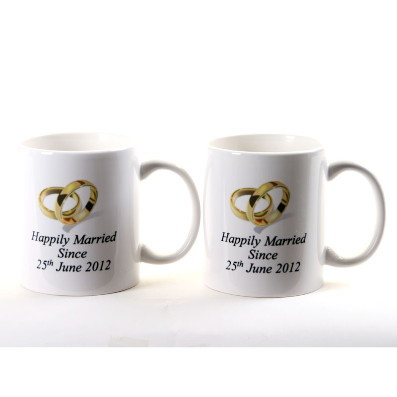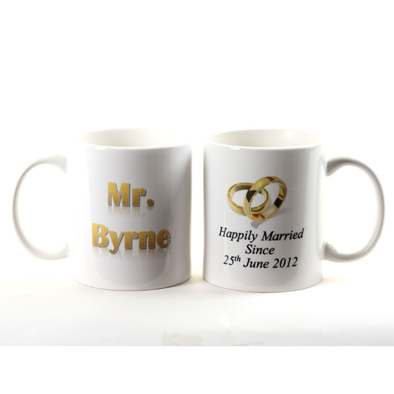 This pair of personalised mugs makes a great wedding or anniversary gift with the happy couple. Their surname's are printed on one side, with the date of their wedding on the other.