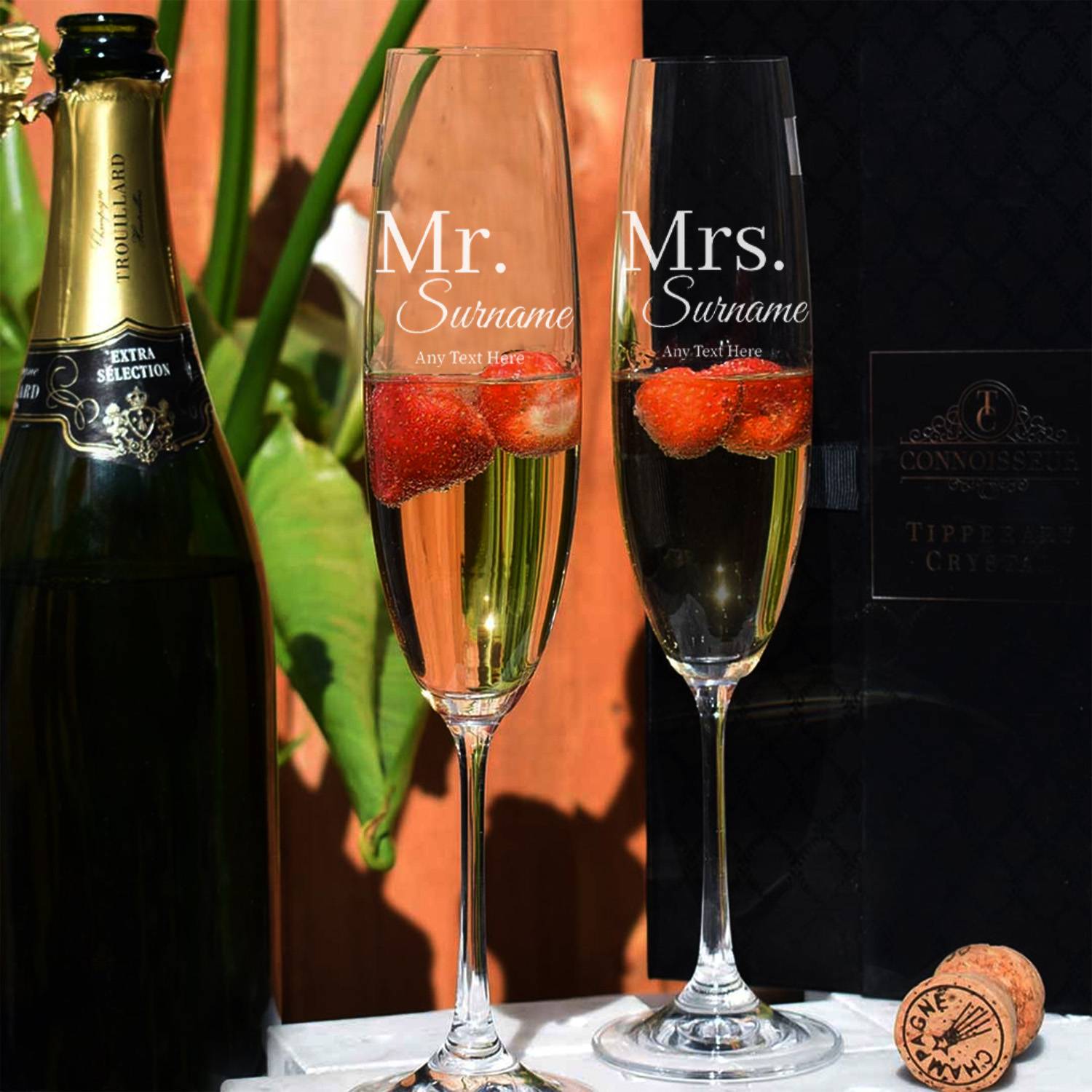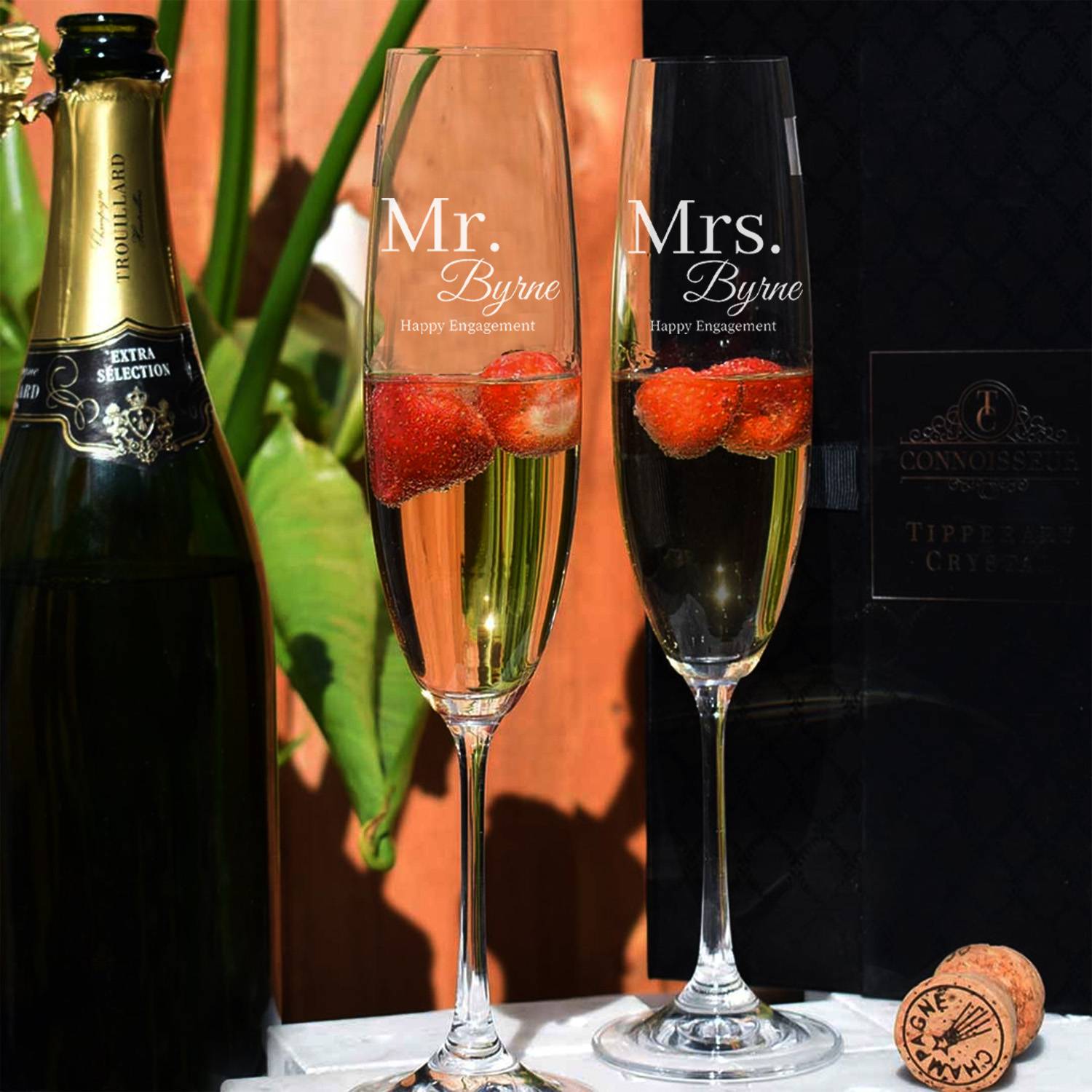 Both glasses can be engraved with the recipient's surname and any text, like a date, Happy engagement, Happy Wedding, etc.