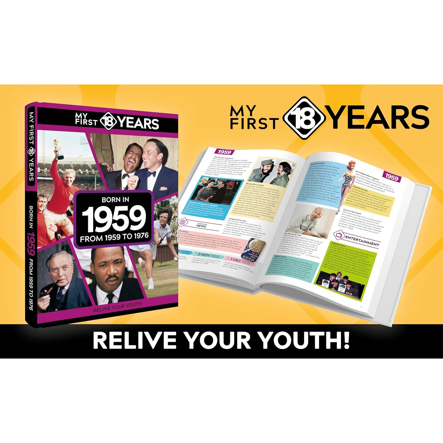 You’ll rekindle literally hundreds of happy, sad and often hilarious memories – whether of favourite cuddly toys, fly-by-night fads or fashionable brands, your first visits to the cinema or garish styles you’ll be amazed that you ever wore. They’re all here, alongside coverage of those eye-popping news stories and seismic world events that helped shape the world you grew up in – and memories, too, of the much-loved stars of sport, stage, music, film and TV who lit up our lives from 1959 to 1976.