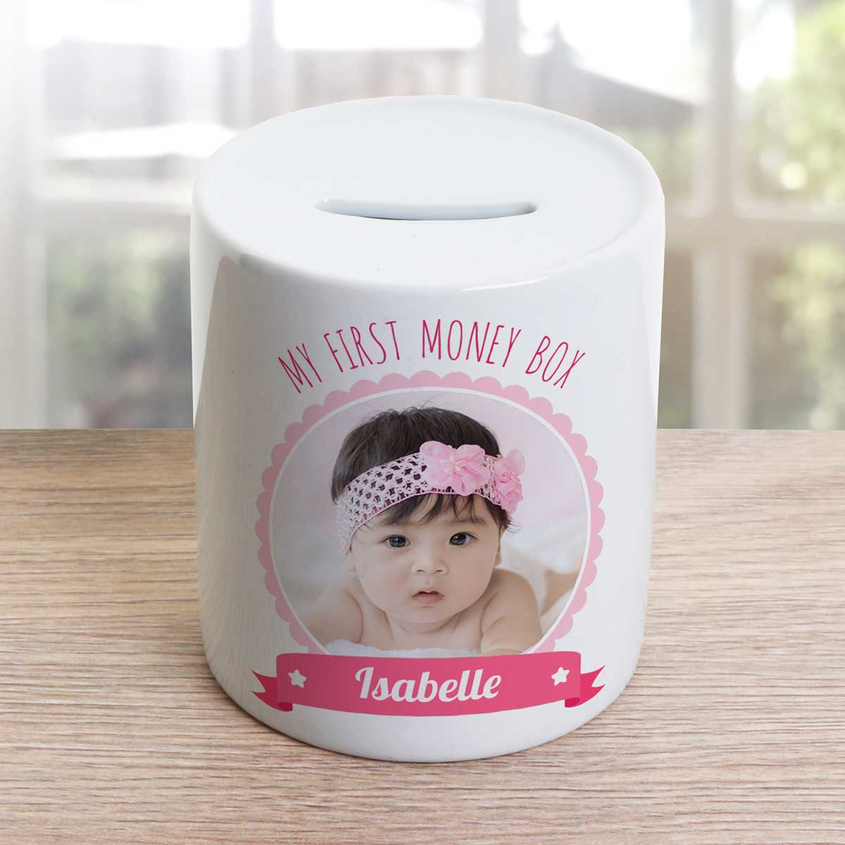 The image incorporating your recipient's name is printed on one side of the ceramic money box with vibrant results. Size: 9,5 cm high x 8 cm diameter (11oz). No need to smash this keepsake to open; the jar is sealed by a rubber grommet underneath which can be opened and resealed.