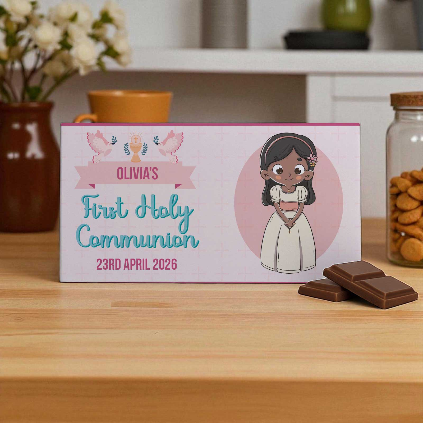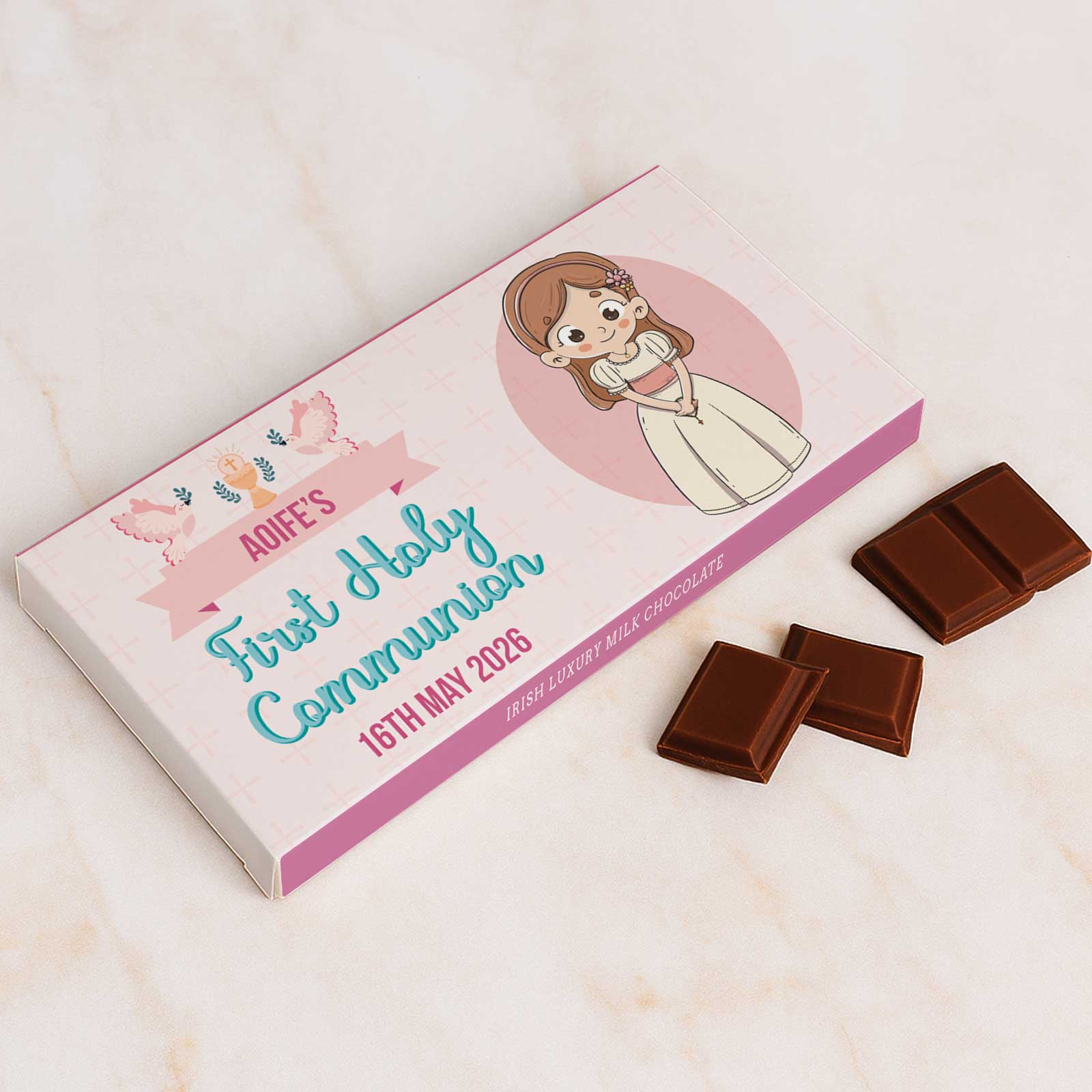 This generous 90g luxury milk chocolate bar is crafted in County Cork, Ireland, ensuring premium quality and rich flavour. The packaging features a charming illustration of a girl in her communion dress, customised with the recipient’s name and the date, making it a unique keepsake that adds a personal and memorable element to the celebration.