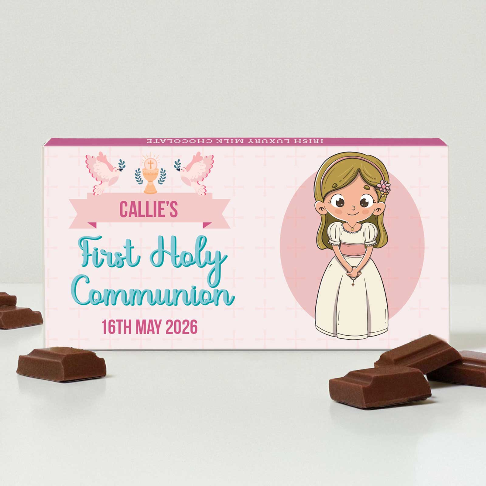 This generous 90g luxury milk chocolate bar is crafted in County Cork, Ireland, ensuring premium quality and rich flavour. The packaging features a charming illustration of a girl in her communion dress, customised with the recipient’s name and the date, making it a unique keepsake that adds a personal and memorable element to the celebration.