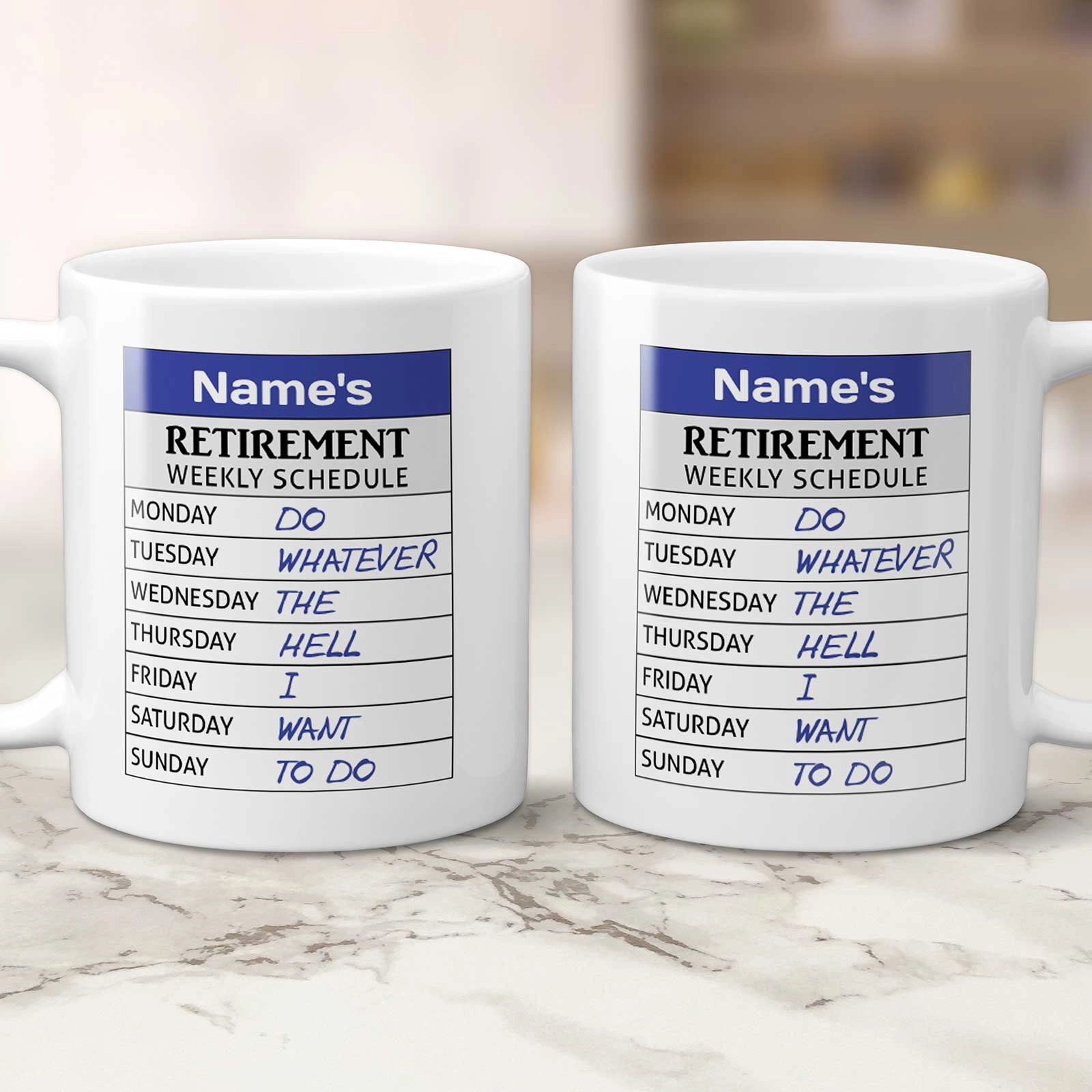 This custom mug is perfect for showcasing the relaxed routine of retired life, with a playful weekly schedule printed right on the side.