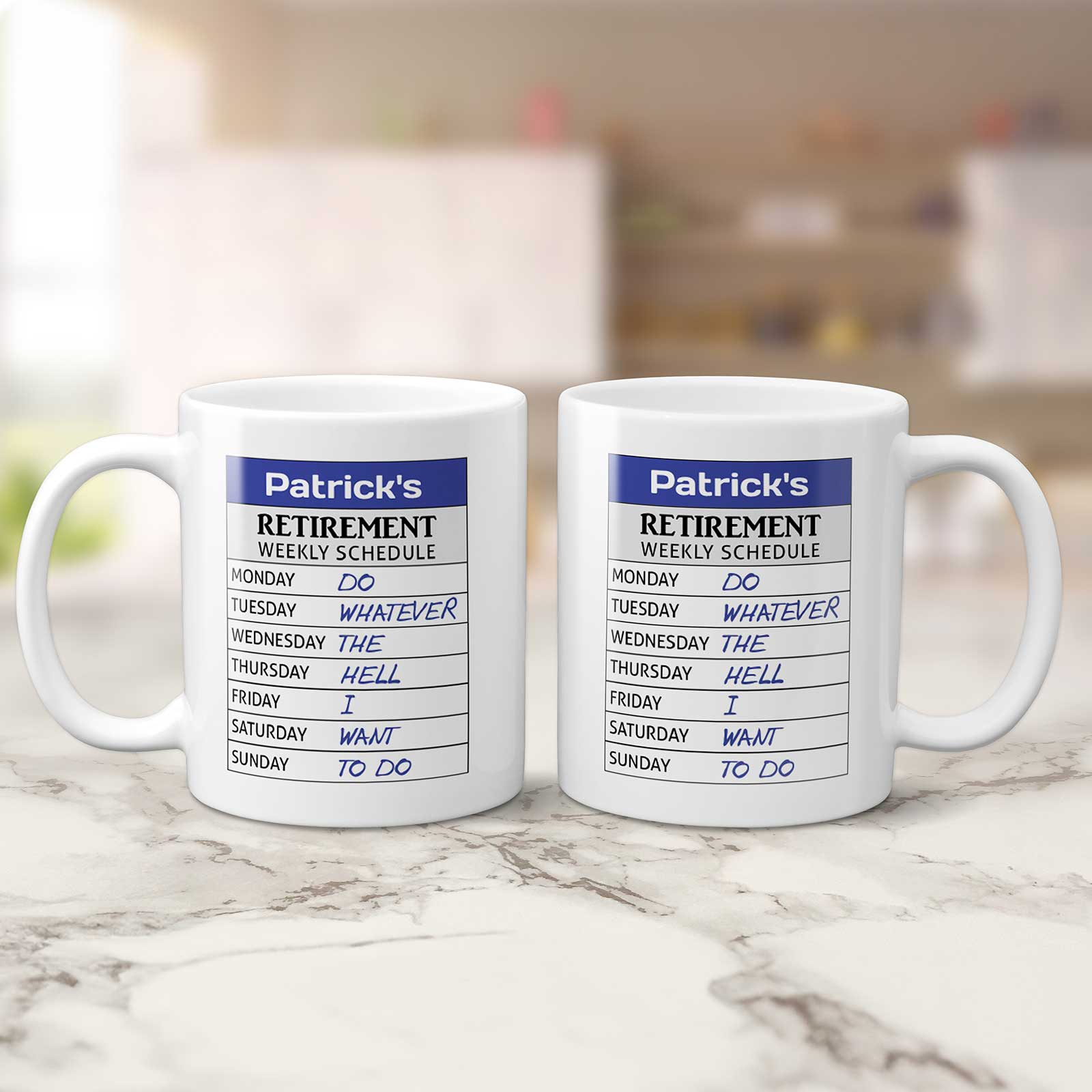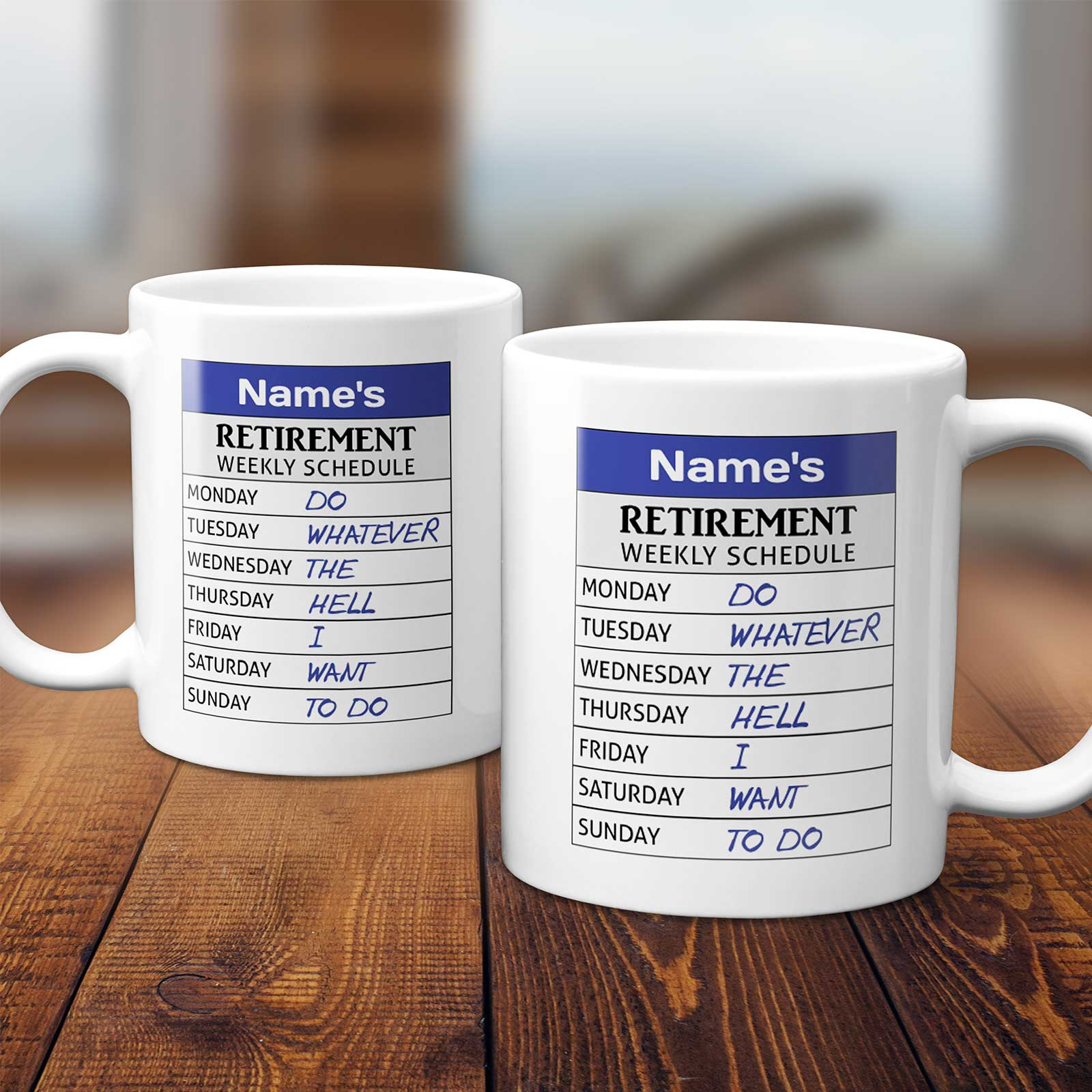 This custom mug is perfect for showcasing the relaxed routine of retired life, with a playful weekly schedule printed right on the side.