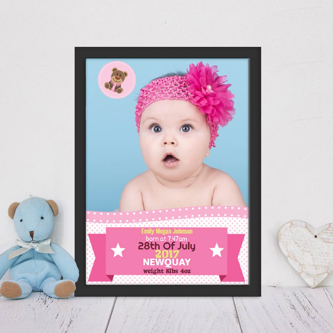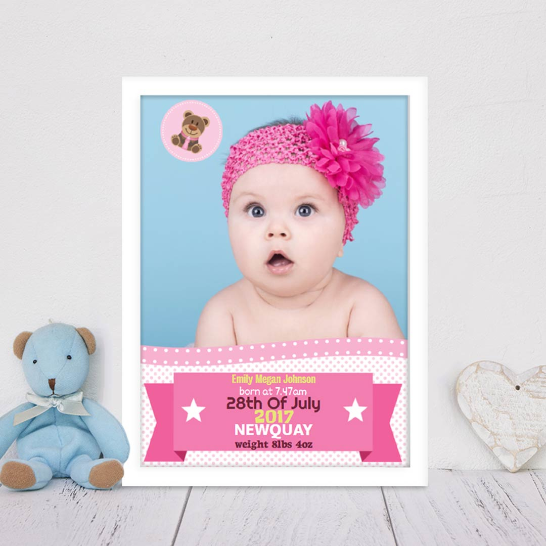 Celebrate the arrival of a precious baby girl with this personalised New Baby Girl Banner & Photo Poster – a perfect keepsake to cherish forever. Customised with her full name, birth date, time, weight, and place of birth, this vibrant and heartwarming print makes a wonderful addition to any nursery wall.