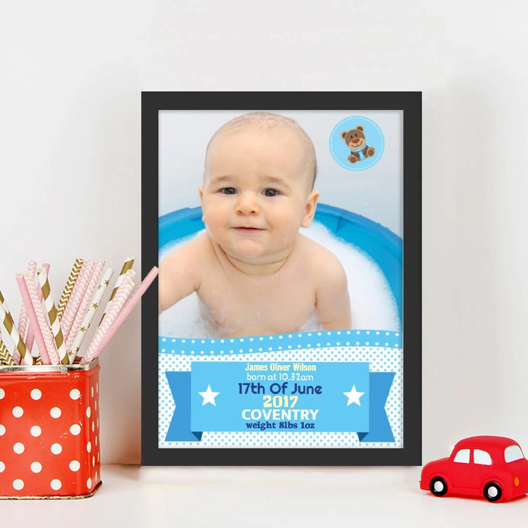Celebrate the arrival of a precious new baby boy with this charming New Baby Boy Banner & Photo Personalised Poster. Perfectly designed to capture the joy and special details of his birth, this vibrant personalised keepsake features the baby’s full name, date and time of birth, weight, and place of birth, beautifully displayed alongside a treasured photo.