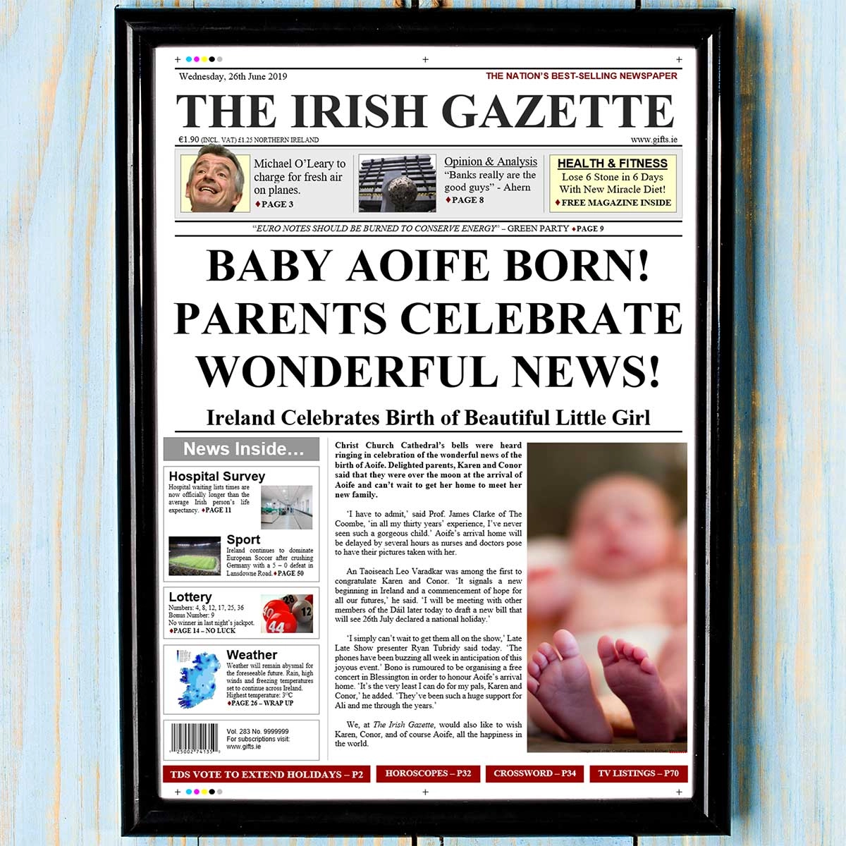 We, at The Irish Gazette, would also like to wish MOTHERFIRSTNAME, FATHERFIRSTNAME, and of course BABYNAME, all the happiness in the world.