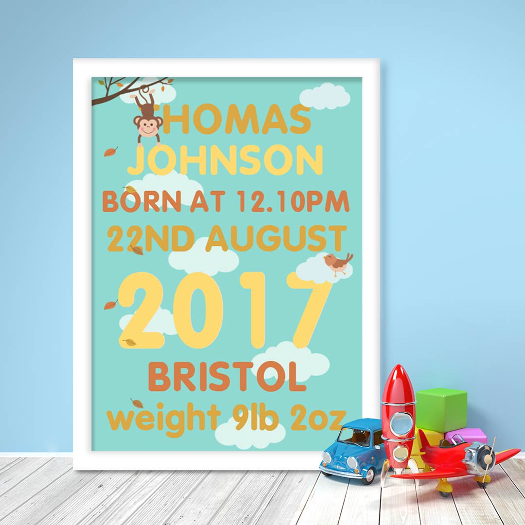 Celebrate the arrival of a newborn boy with this adorable New Born Boy Cute Cloud Personalised Poster. Designed to brighten up any nursery, this charming print features personalised details including the baby’s full name, date and time of birth, weight, and place of birth—making it a truly unique keepsake.