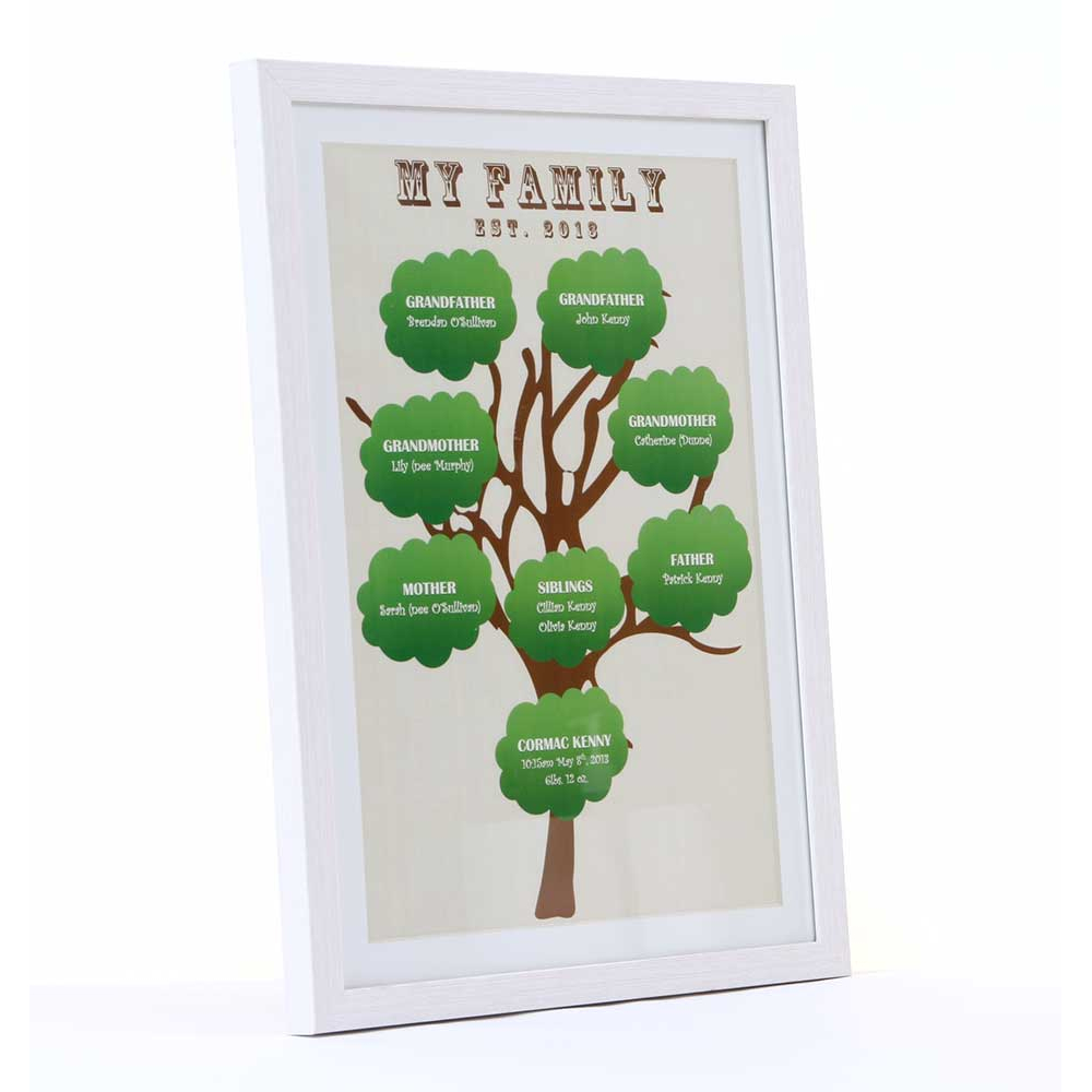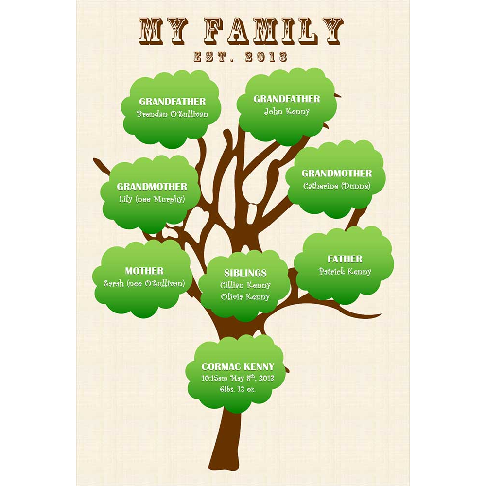A beautiful gift for any new born that will look fantastic in new Baby's new nursery! The print contains a family tree of Baby's details, siblings (if applicable), parents and granparents.