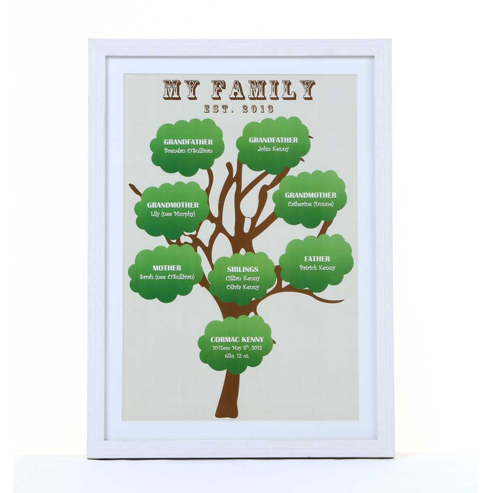 A beautiful gift for any new born that will look fantastic in new Baby's new nursery! The print contains a family tree of Baby's details, siblings (if applicable), parents and granparents.