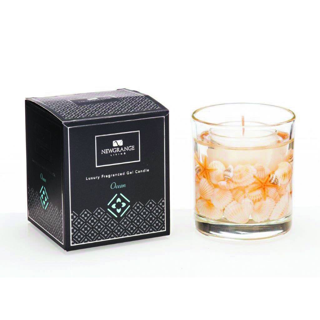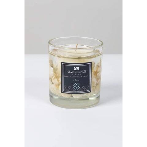This candle has a simple glass exterior with a gel, shell infused interior and boasts of beautiful fresh ocean scent notes.