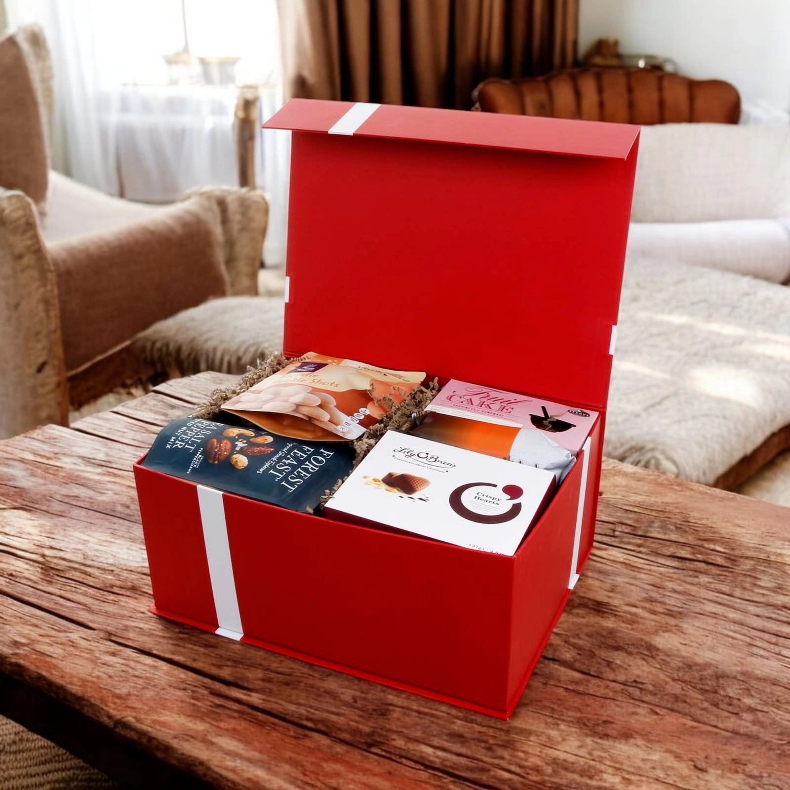 The hamper is presented in our new luxury red gift box with satin bow. Stylish and reusable, the gift box is packed inside a separate shipping box for secure transport.