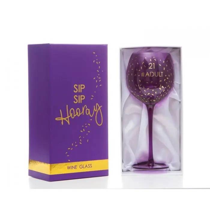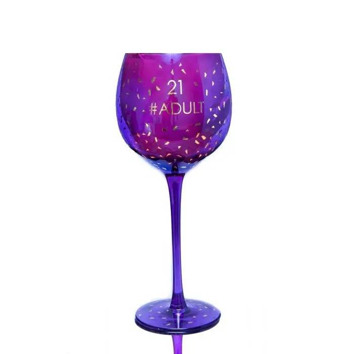 Twenty one. The age of FINALLY becoming an adult! Celebrate a special 21st Birthday with a bang with this glamorous 600ml opulent wine glass! Deep purple with gold confetti-style foil detail and text that reads “21 #ADULT”, this beautiful and unusual party glass is luxurious in style and sparkles in the light! Complete with a gorgeous silk lined gift box in purple with delicate gold detail, this decorative glitzy glassware makes the perfect gift for a special someone on their twenty first birthday! Sip, sip, hurray!