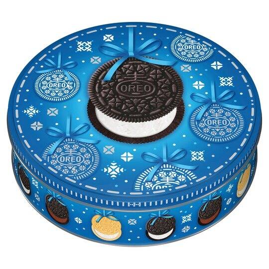 A biscuit tin filled with classic Oreo biscuits- Oreo Original, Oreo Golden and Oreo Choc'o Brownie.