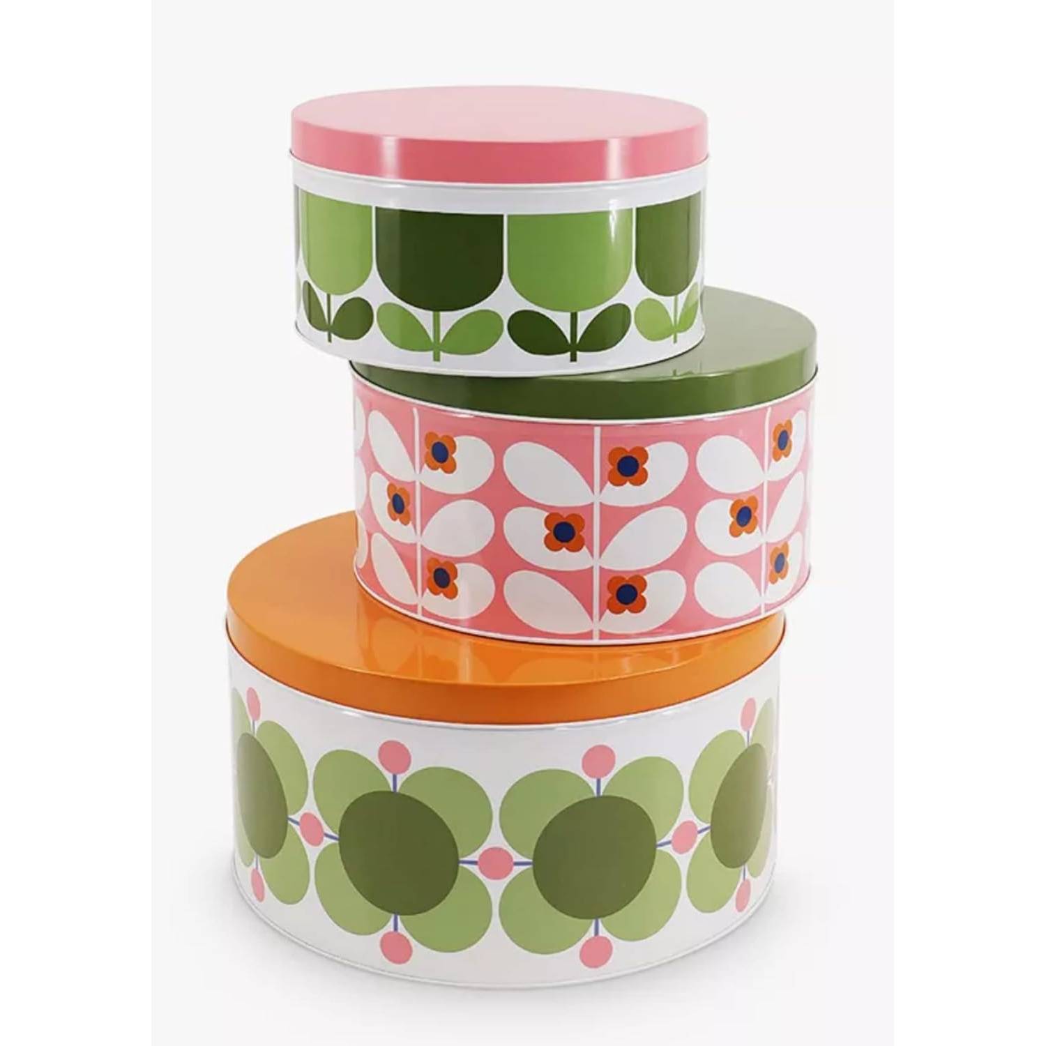 From one the world's top fashion designers Orla Kiely, comes these set of three metal cake storage tins three differrnt designs.